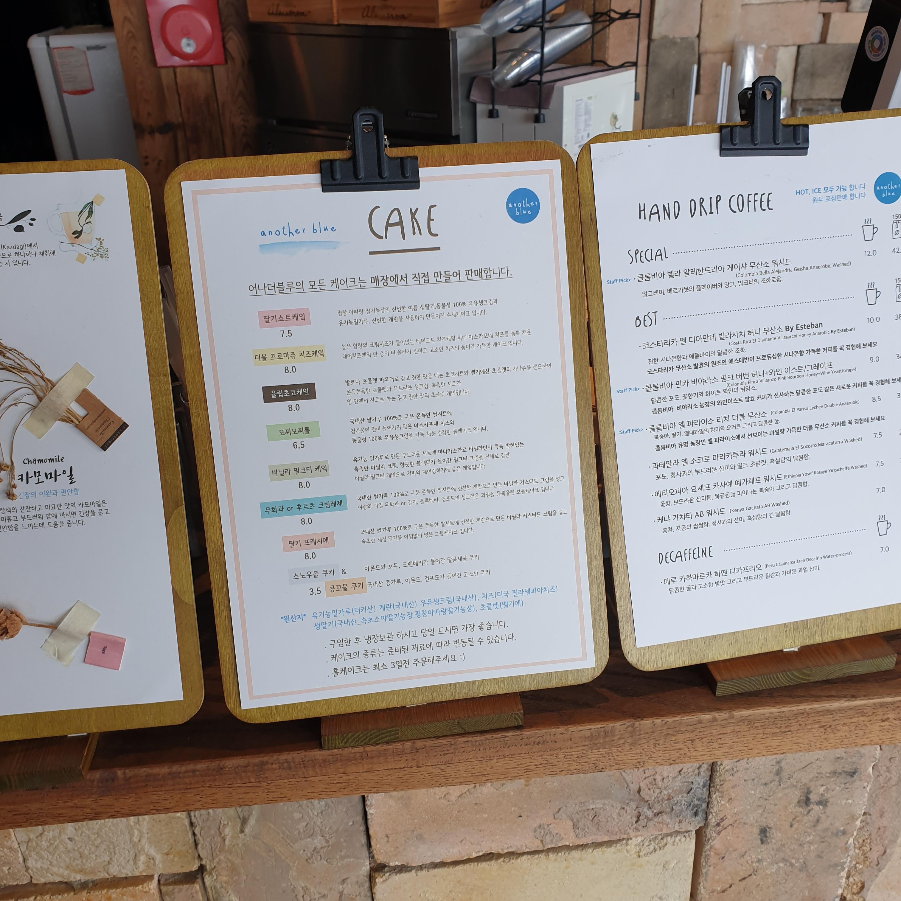 케이크, 핸드드립 커피와 일반 커피 메뉴판입니다.