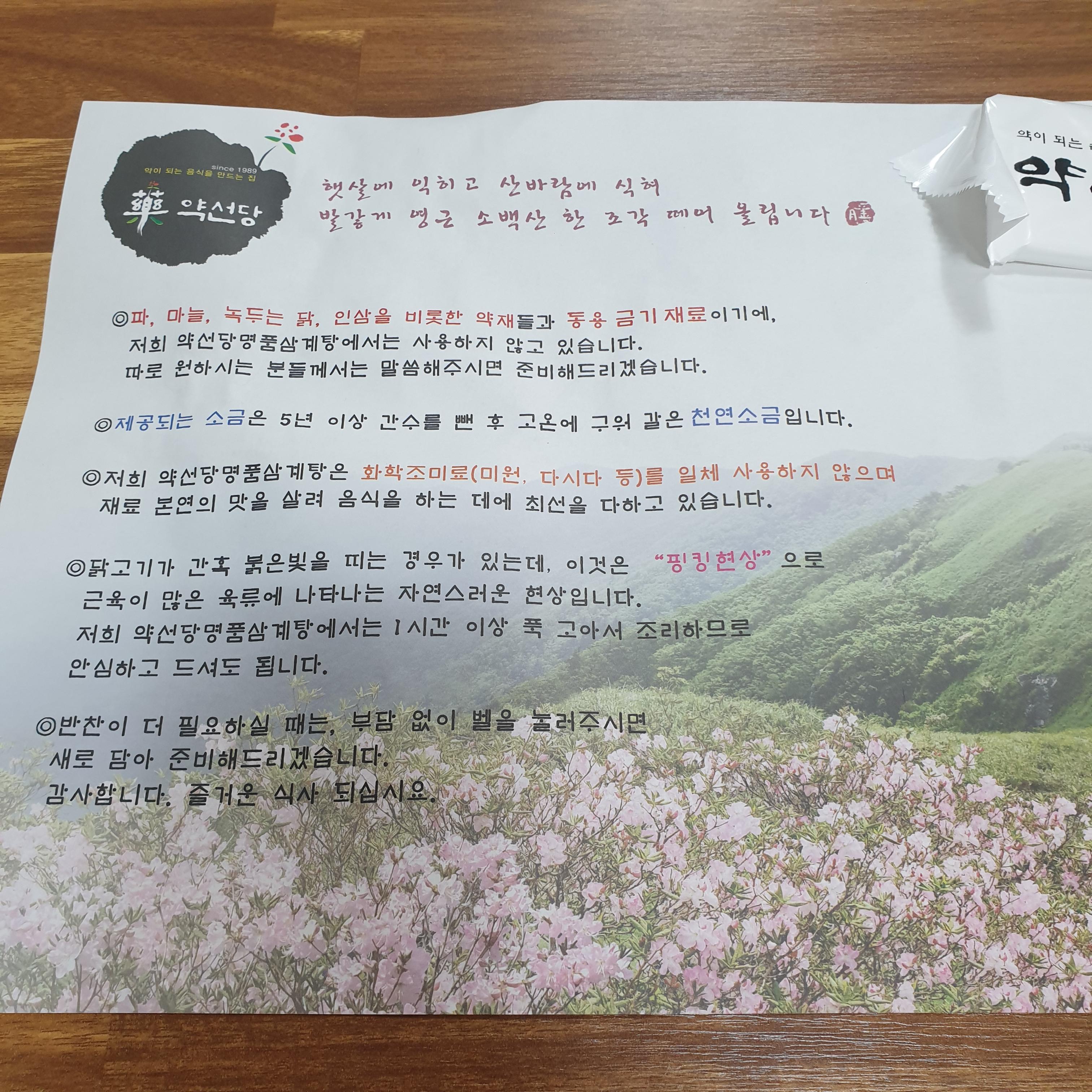 약선당 삼계탕 식탁에는 종이 식탁보가 있고 뭔가 글이 많이 쓰여 있는데요 읽지는 않았습니다.