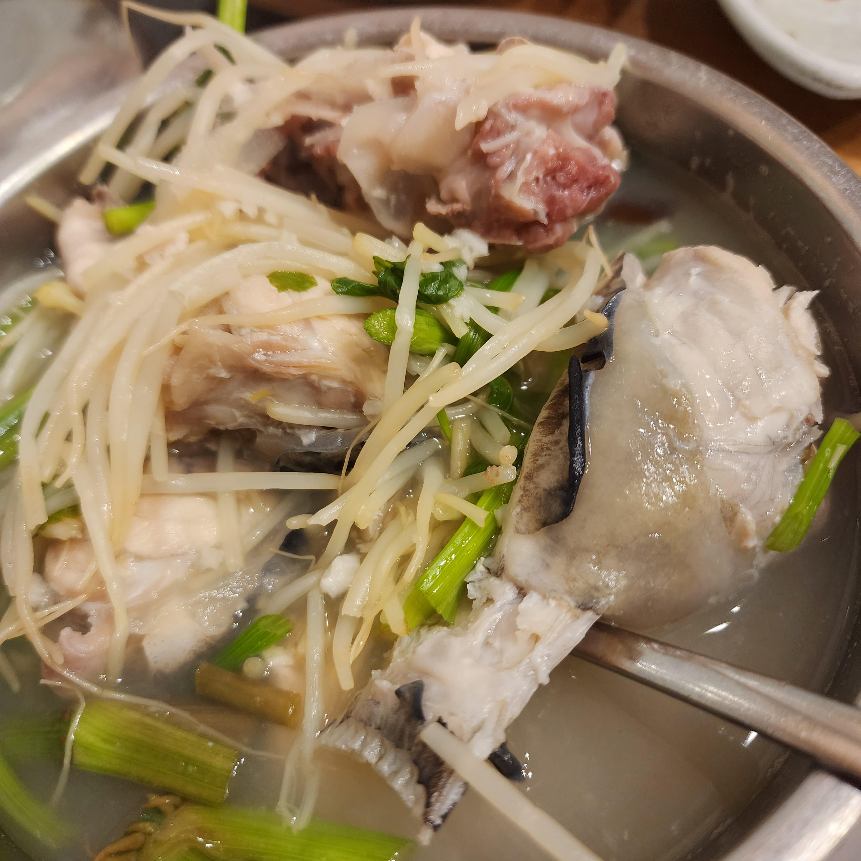 대망의 주인공 "참복맑은탕"입니다. 일단 생선 살이 도톰하고 촉촉해서 아주 먹기가 좋아보입니다. 국물도 뽀얗고 맛있어보입니다. 진짜 먹어봐도 맛있더라구요. 뜨끈하고 시원하니 속이 풀리는 느낌이었습니다. 국안에 들어가있는건 미나리와 콩나물일까요 ? 아무튼 시원하고 맛이 좋았습니다. 소문이 왜 났는지 알거같았어요.