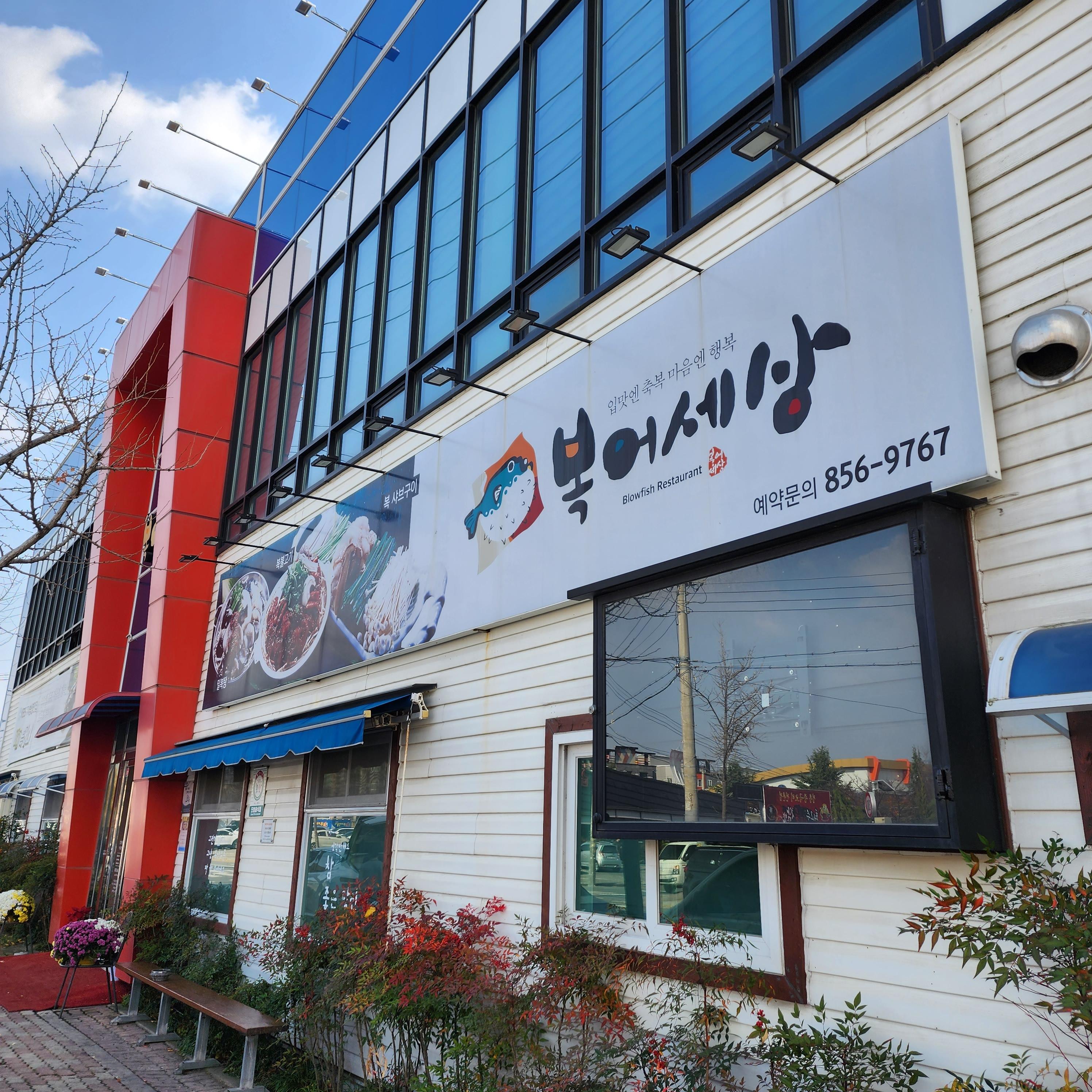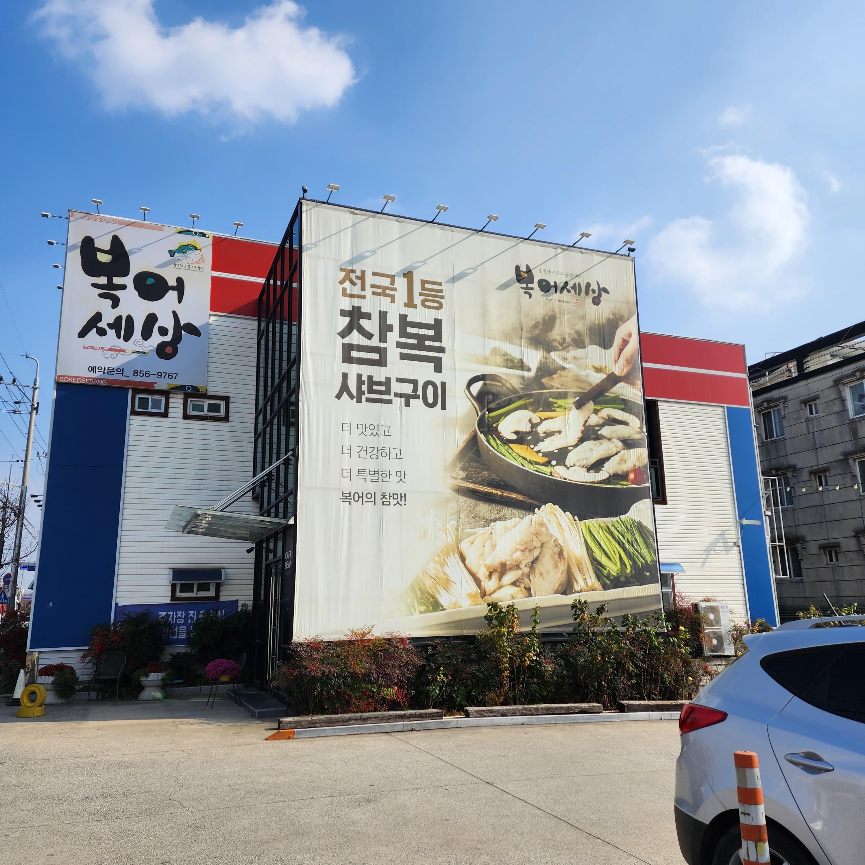 복어세상의 외관입니다. 큰 건물이 인상적입니다. 옆에는 넓고 큼직한 주차장도 준비되어있어서 정말 편리합니다. 이 지역엔 밥집이 많아서 주차난을 걱정했는데 아주 편하게 주차했습니다.