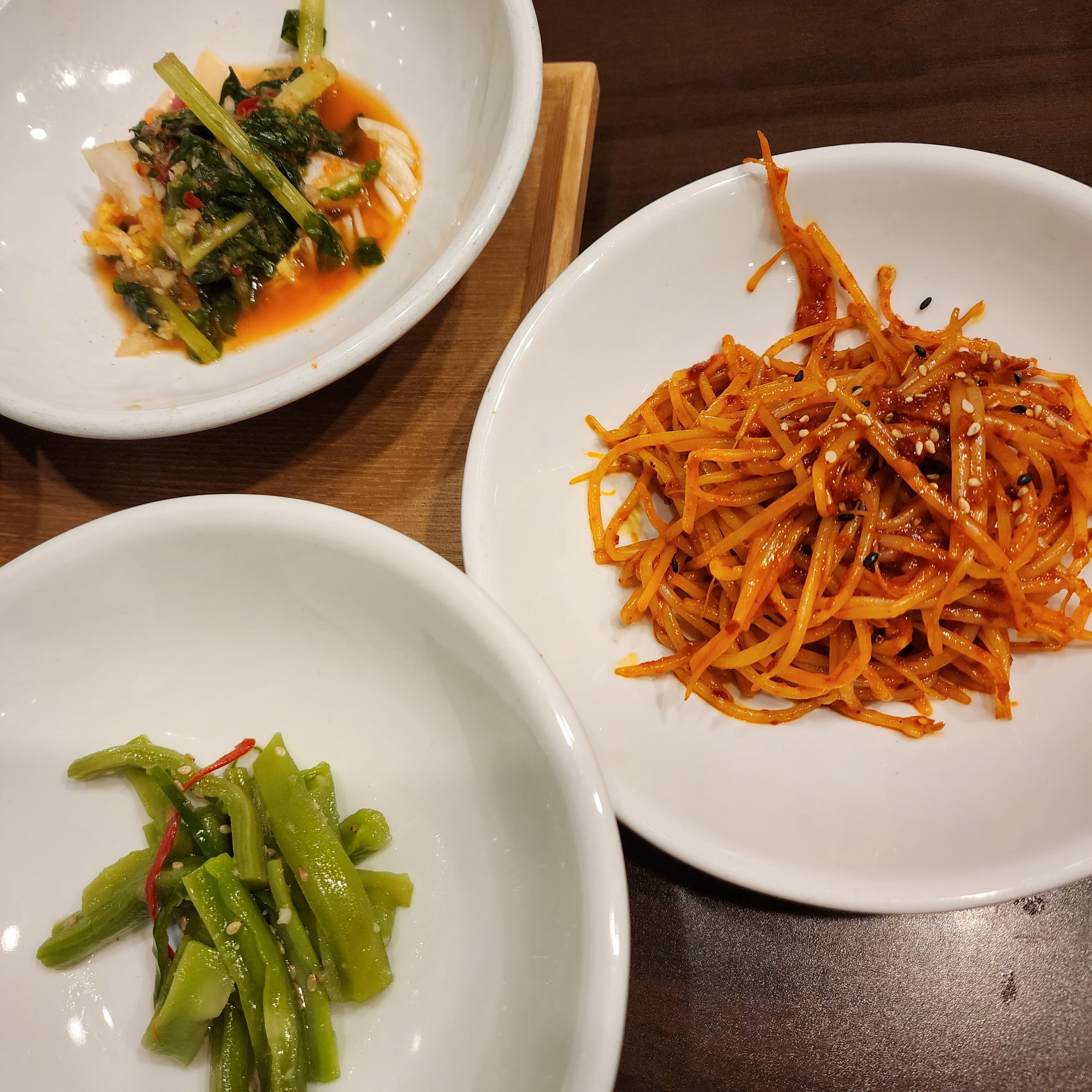 반찬들입니다. 퀄리티가 아주 좋아보입니다. 그러나 개인적으로 잡채는 맛있긴 한데 맛있는 잡채는 아니었습니다.(?) 그리구 마지막에 있는 튀김은 뭔지 맛있긴 한데 덜어둔지 오래되어 그런지 서로 단단히 붙어있더군요. 먹기는 불편했으나 맛은 좋았습니다(?) 나머지 반찬들은 제 입에두 잘 맞았어요.