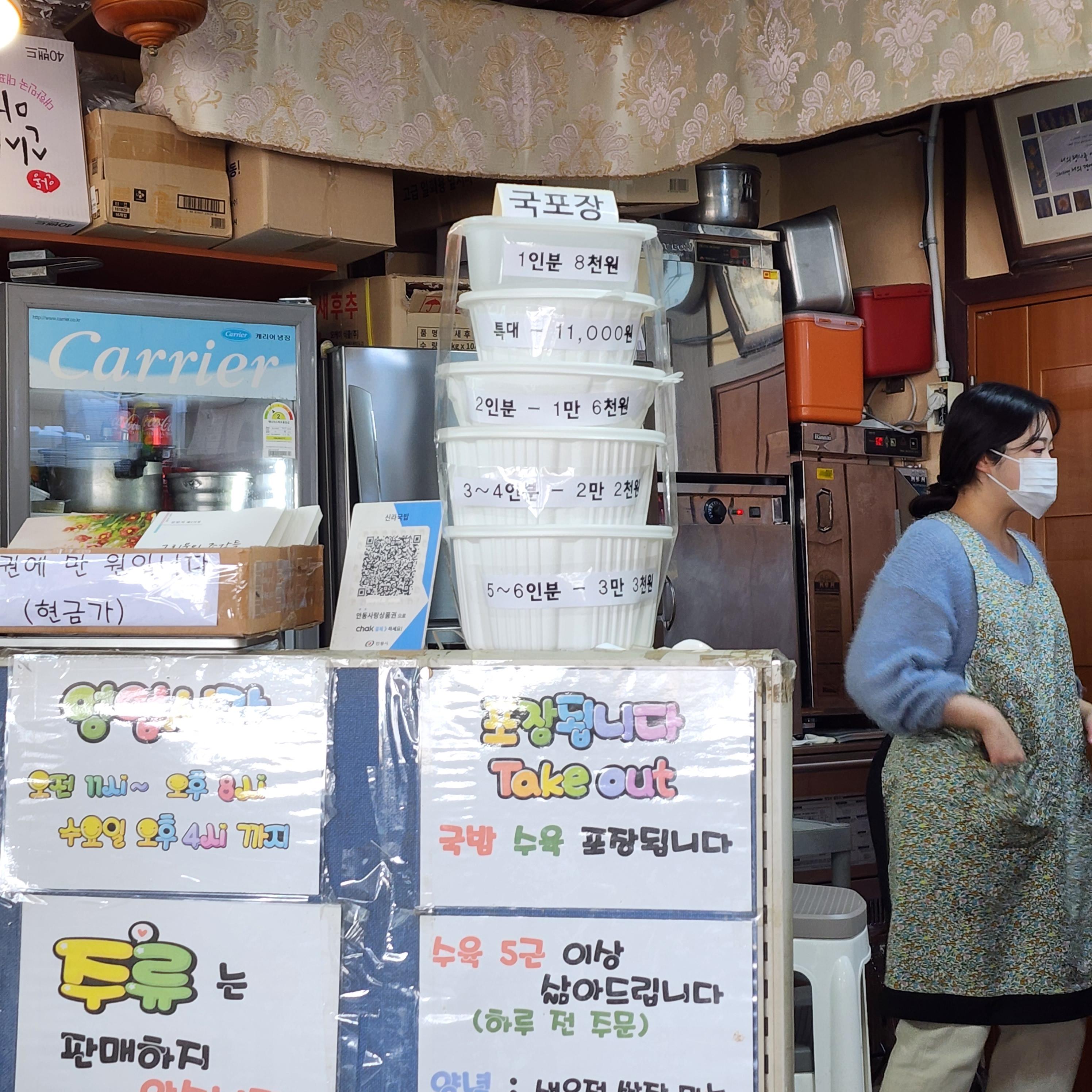 지금 진행중인 이벤트들인것 같습니다. 국포장 그릇을 아예 전시를 해놔서 양을 직관적으로 파악할 수 있도록 해놨더군요. 수육 5근의 경우 하루 전 주문하면 삶아주기까지 가능... ㄷㄷ 5근이면 3kg이겠죠. 이런 주문도 받는걸 보니 맛집으로서의 포스가 강렬하게 느껴졌습니다.