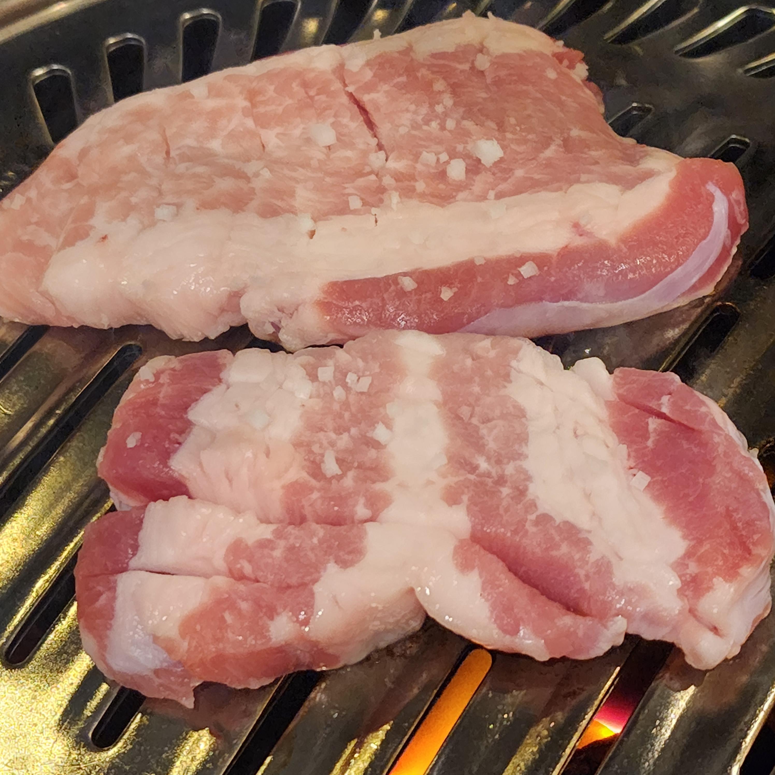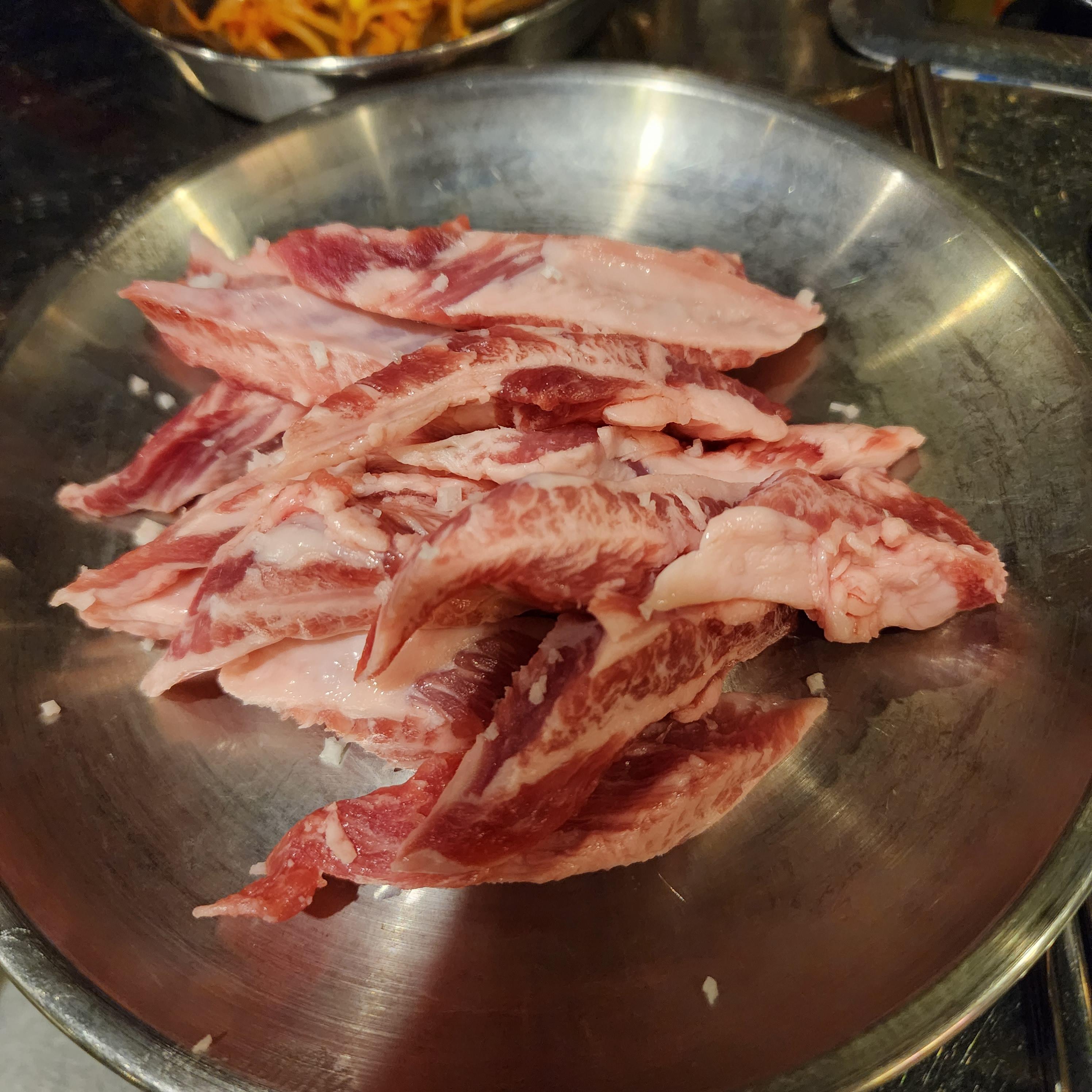 이베리코 갈빗살입니다. 사진을 보고 있으니 메뉴가 이베리코 목살이랑 돼지 생갈빗살이었는지 헷갈리는데 메뉴판 사진이 없어서 긴가민가 합니다. 갈빗살은 아무래도 이렇게 생긴 게 보통이다 보니... 아무튼 고기들을 이리저리 구워서 맛있게 먹었습니다. 정말 맛있었습니다. 대 만족한 느낌.