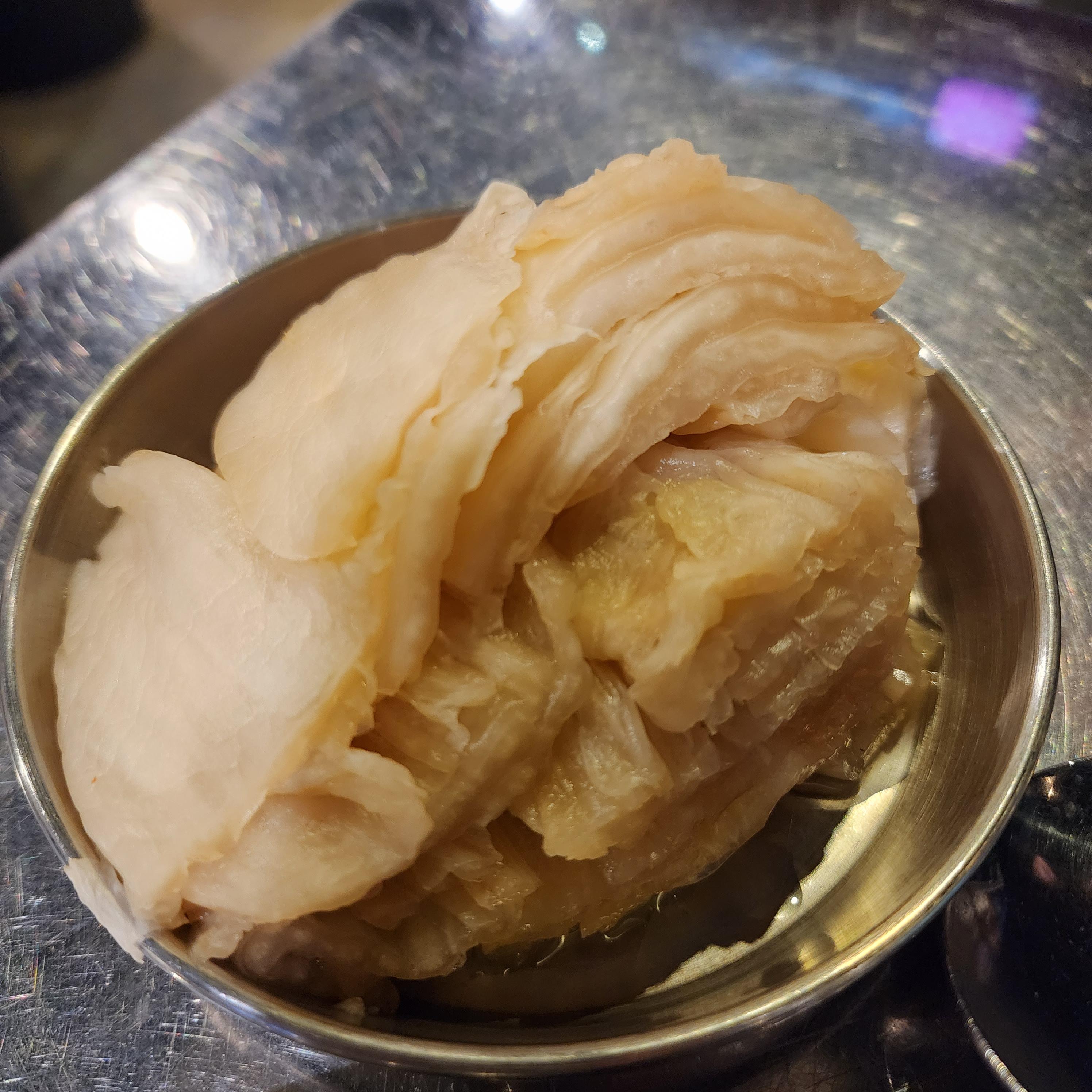 그리고 여기서 신기한 모습이 나오는데 불판에 백김치와 고사리를 같이 올려 볶아주십니다. 그런데 이게 아주 기가 막힙니다. 정말 맛이 좋고 다른 데서는 맛보기 힘든 새로움이었습니다. 사장님은 돼지고기의 느끼함을 씻어주는 백김치가 특히 인기가 좋다고 하시네요.