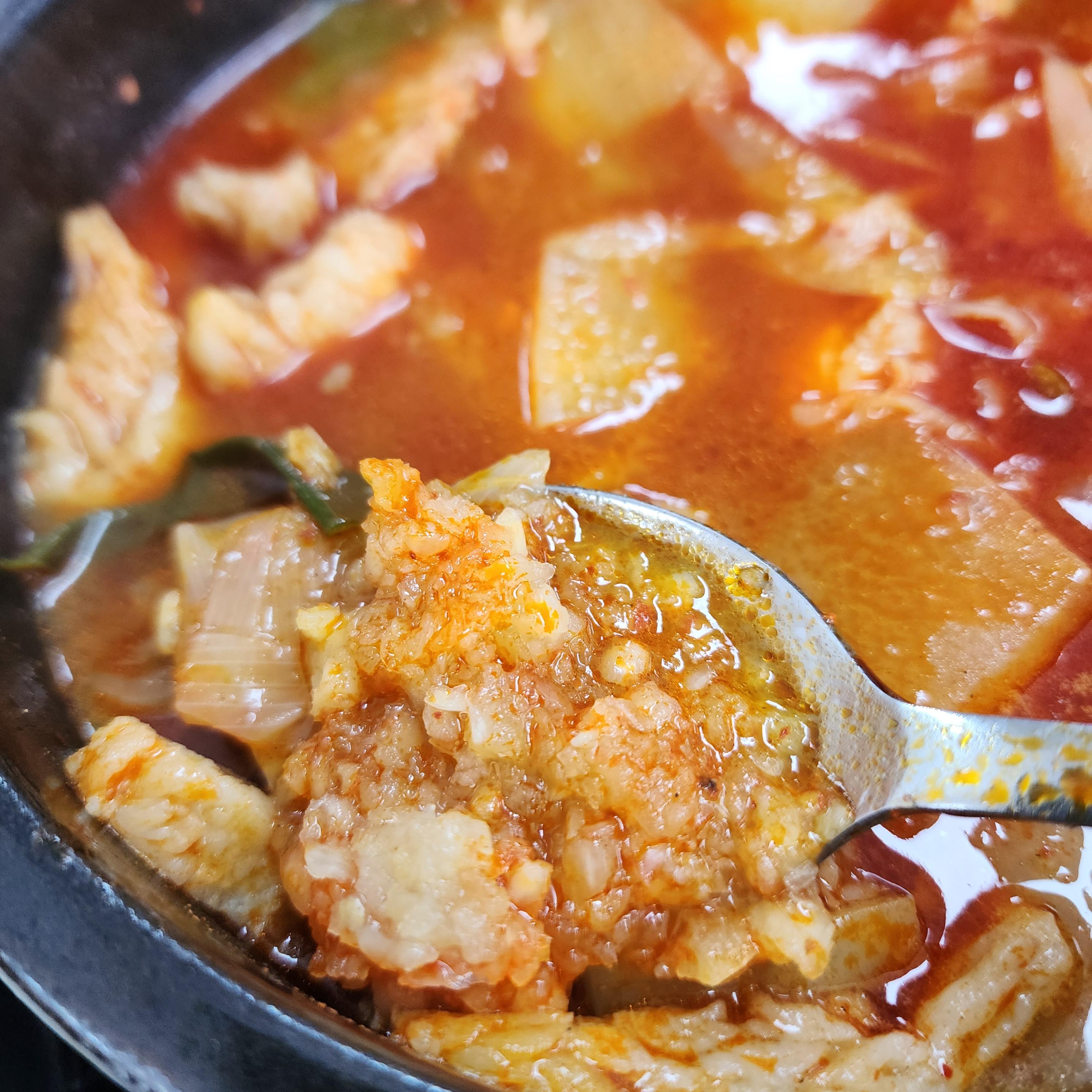 국보해장국의 한우수구레국밥 특(15,000원)입니다. 건더기가 정말 많고 수구레가 많이 들어있습니다. 여타 수구레국밥에는 선지덩어리가 들어간 경우도 본것 같은데, 이곳은 선지는 없고 수구레만 들어가 있습니다. 국물은 살짝 기름집니다. 사진에도 고추기름인지 고깃기름인지 기름이 국물 위에 어느 정도 올라가 있는 게 확인이 됩니다.