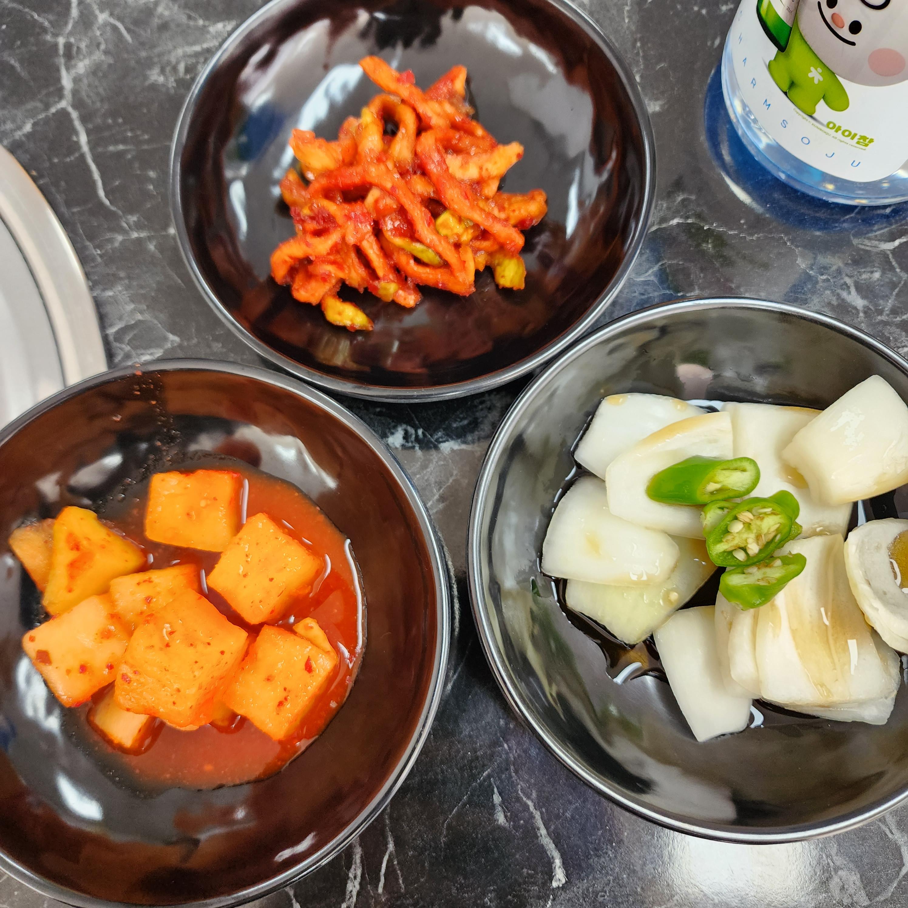 기본 반찬입니다. 정말 기본 반찬이구요. 깍두기, 무말랭이, 생양파 간장무침? 정도가 되겠습니다. 그리고 사진에는 담기지 않았지만 다진 마늘을 한통 주십니다.