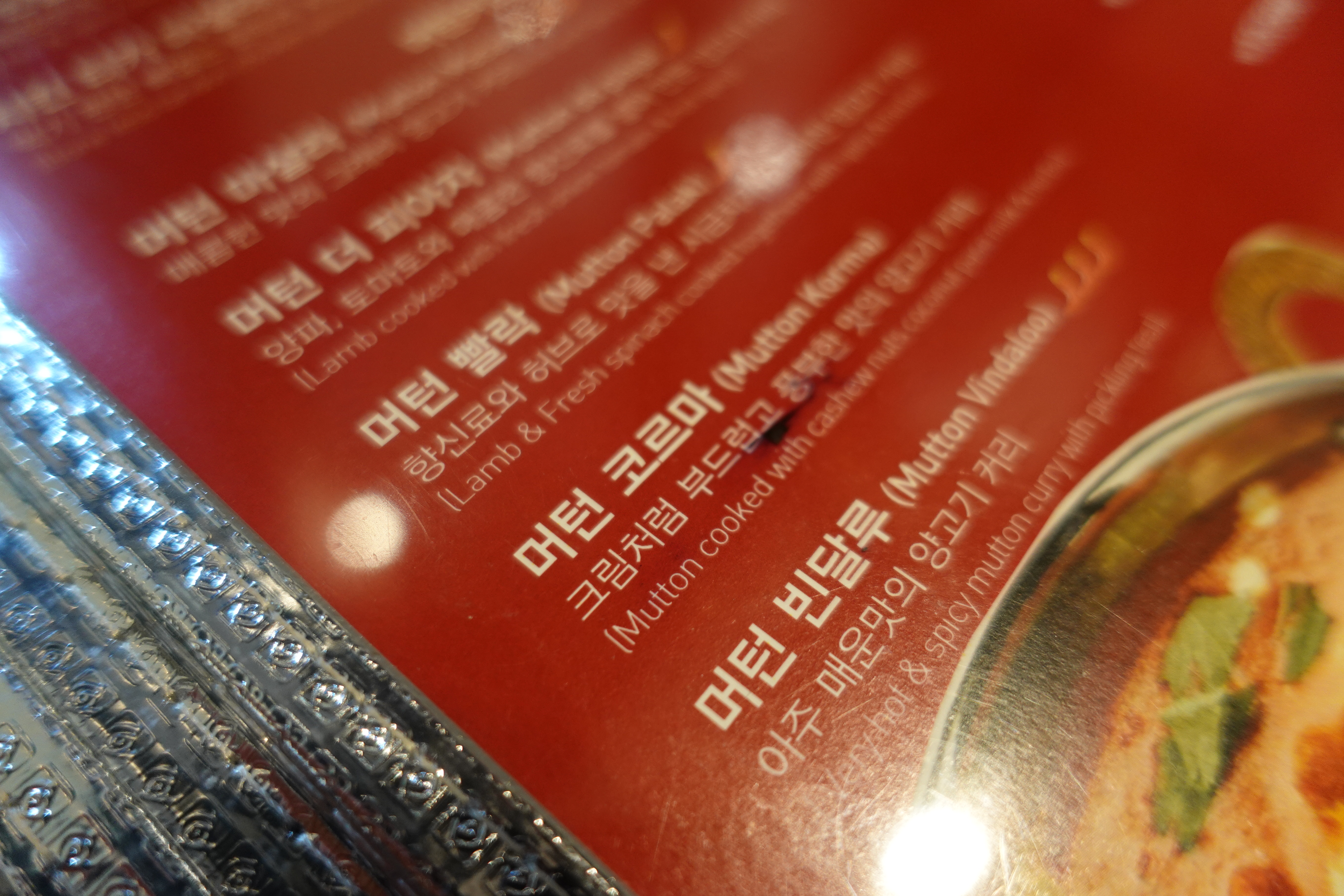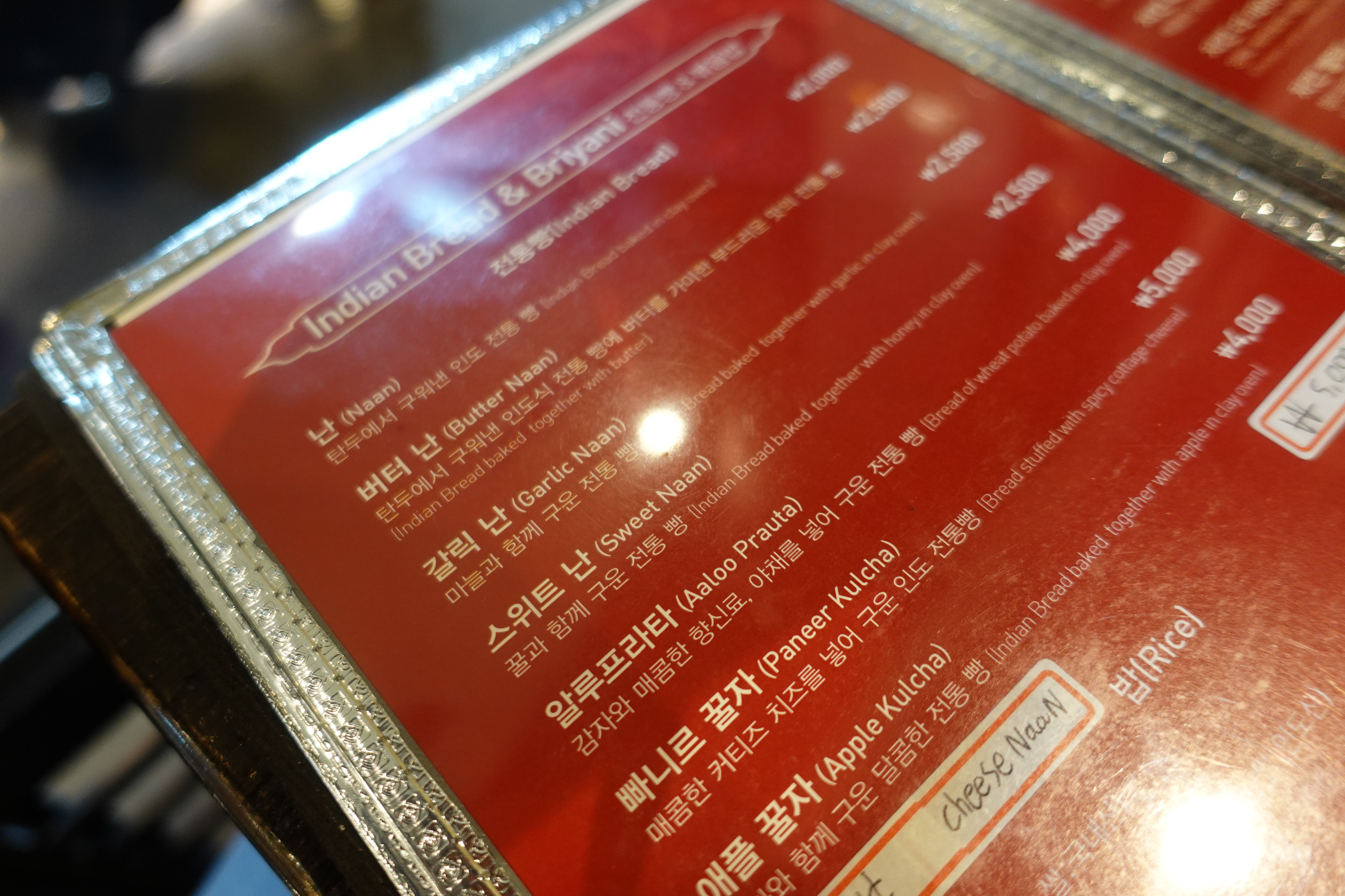 메뉴판입니다. 가격들은 다른 인도카레집과 비교하면 비슷하거나 비쌉니다. 안산이나 신림 등 외국인 거주지는 제외하고 생각했을때입니다. 난은 기본적으로 3피스가 나오기 때문에 다른 요리와 먹을때 난을 사람 수에 맞춰서 주문하면 양이 너무 많을 수 있습니다.