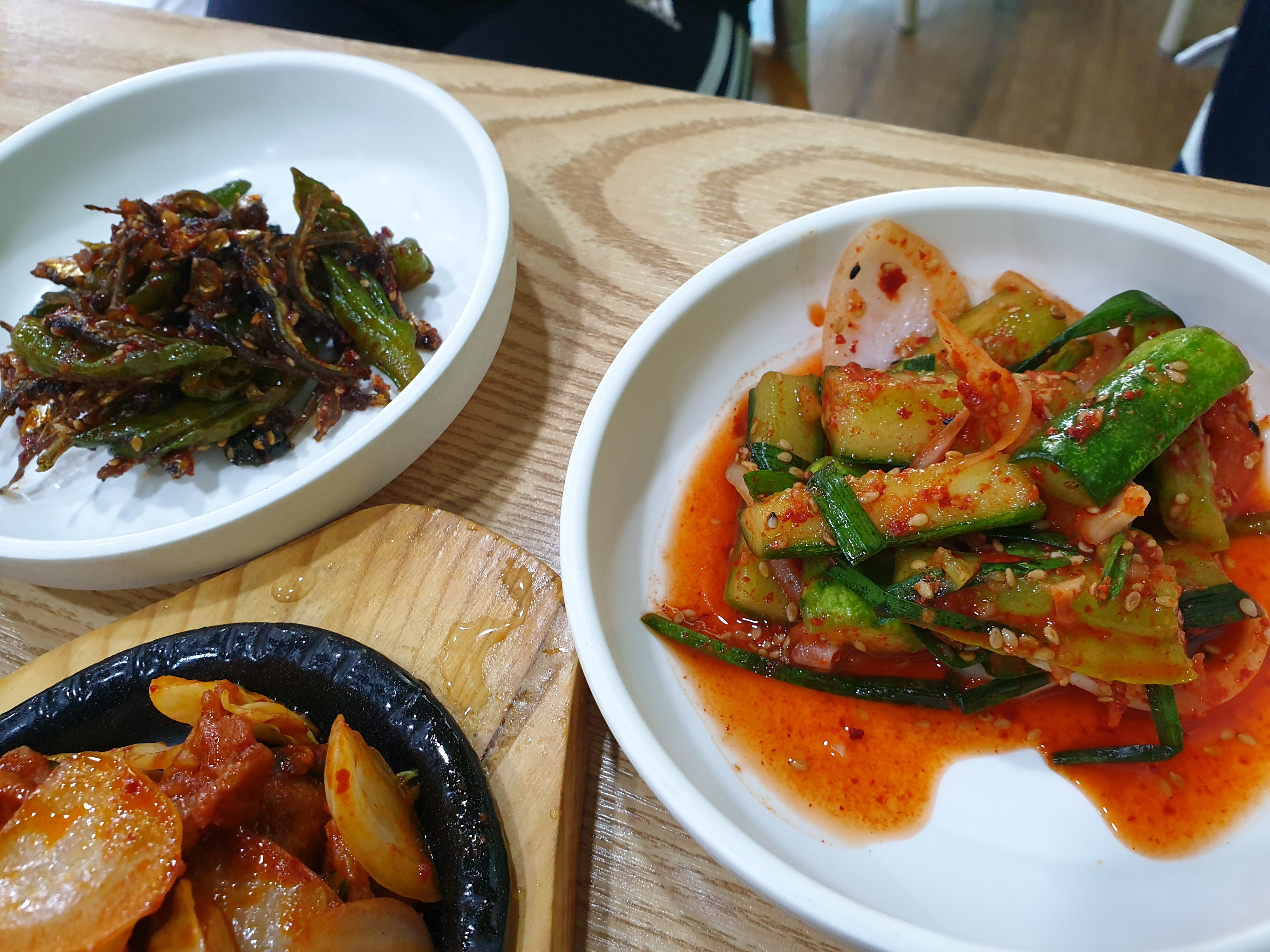 먼저 밑반찬 멸치고추 볶음과 오이소박이 입니다.