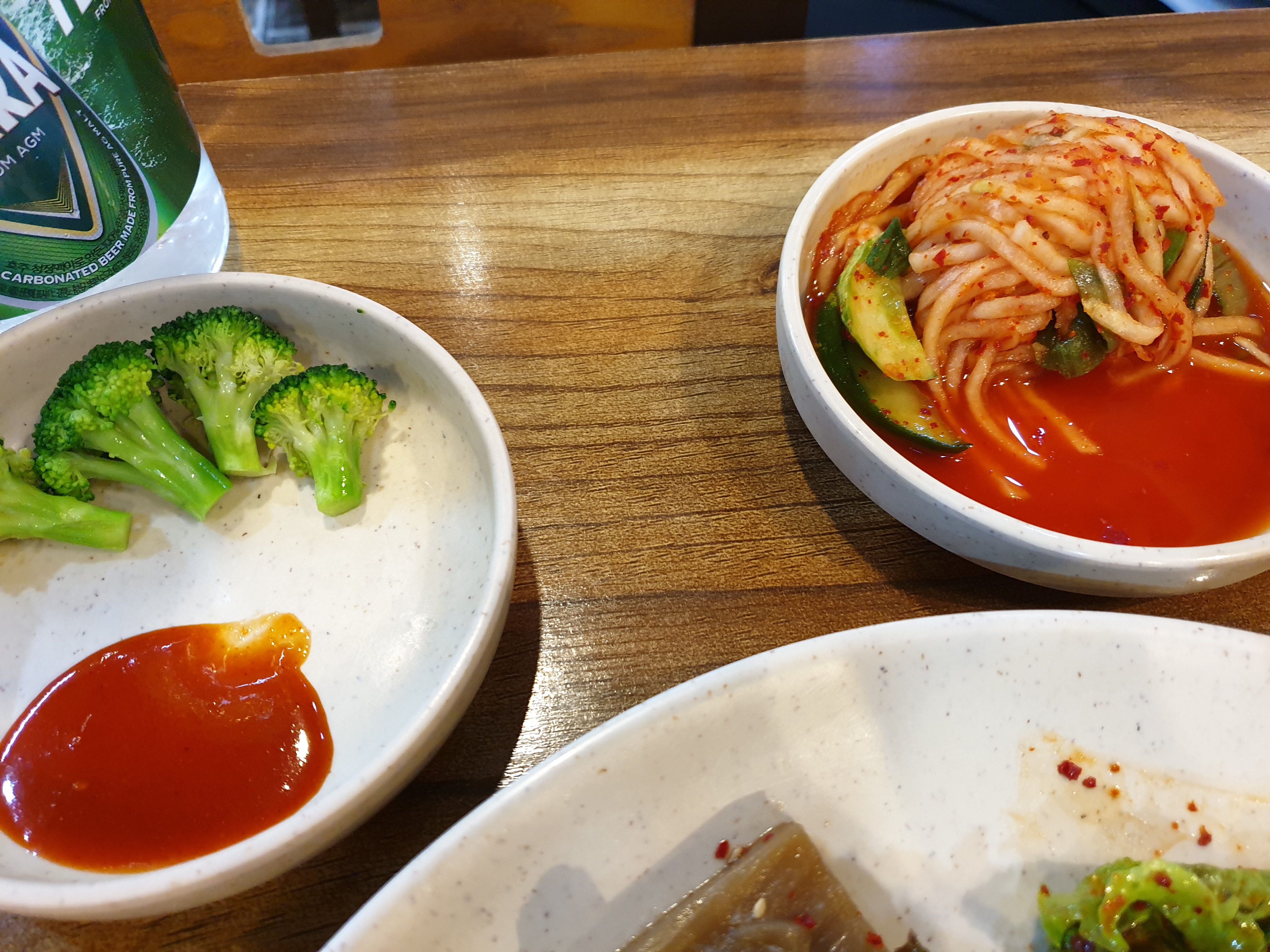 근본 술안주 브로콜리 대친것과 무채+오이김치입니다.