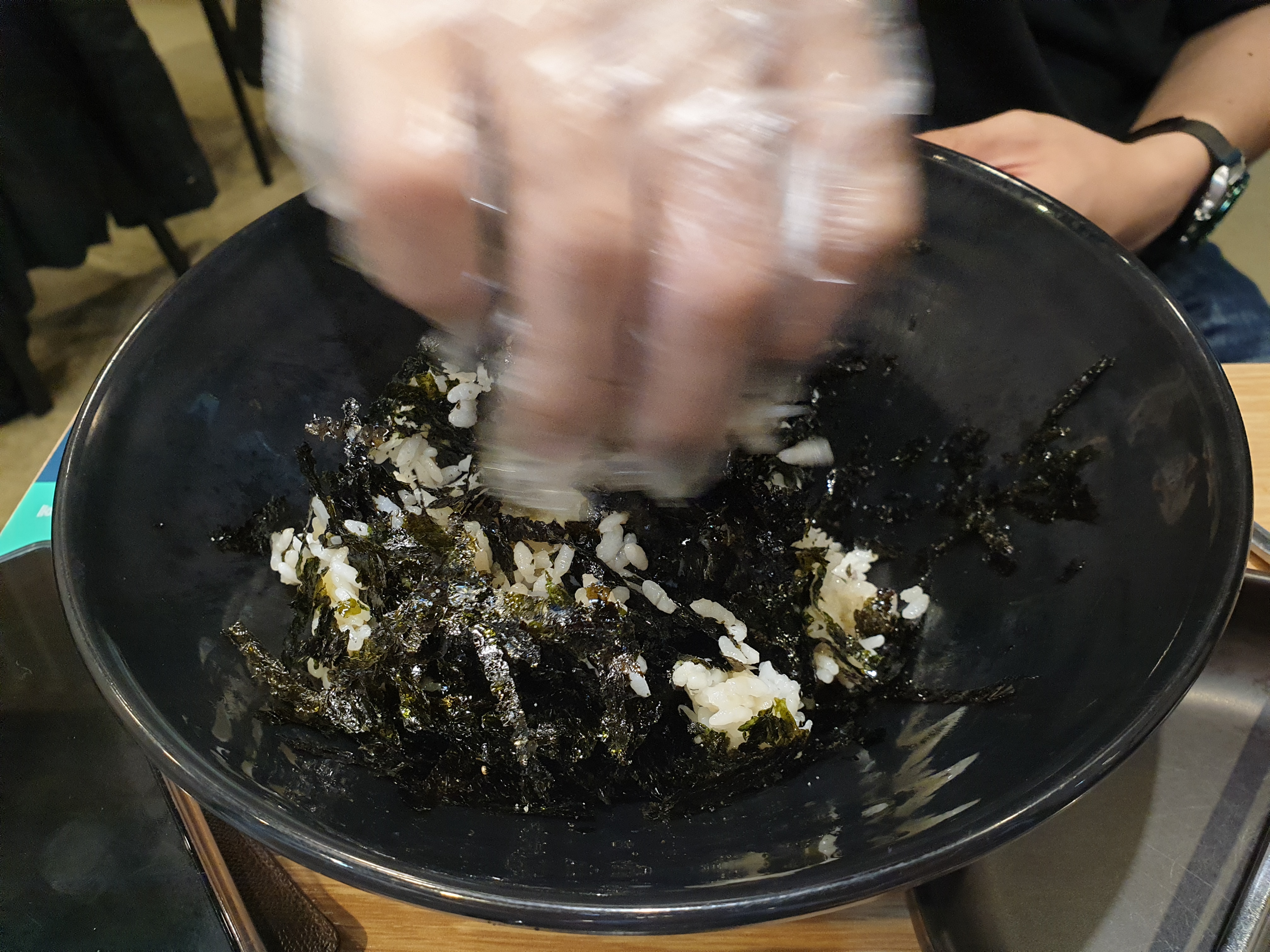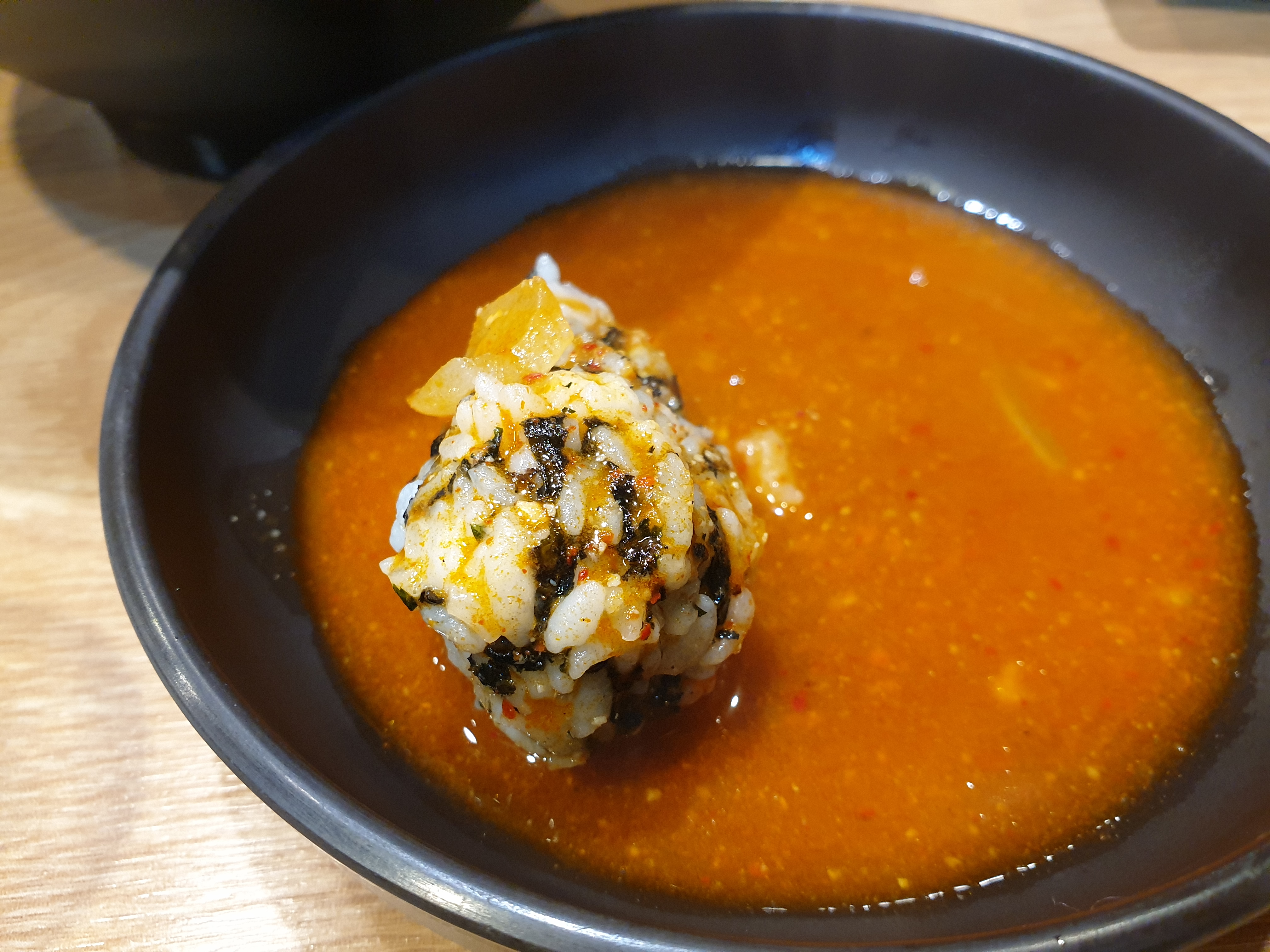셀프 주먹밥 위에 곱창 대창의 기름이 잔뜩 첨가된 곱도리탕 육수를 얹어 먹어봤습니다.