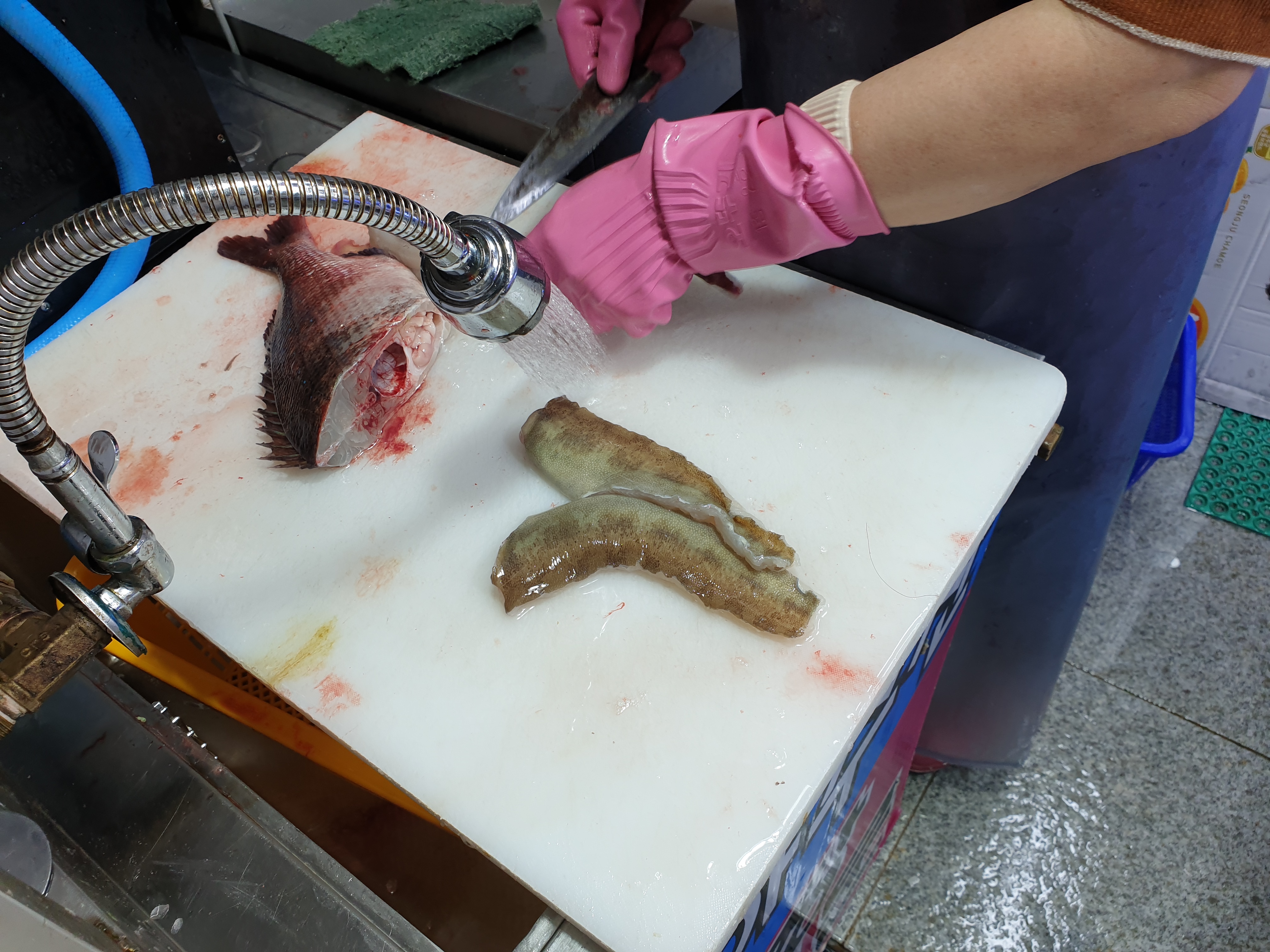 일단 베이스로 도미 한마리를 썰었습니다. 그리고는 사이드로 추천해주시는 놈이 처음에는 저 뾰쪽거리는 전복치. 맛이 얼마나 어마어마한지 마리당 8만원이라고 하시는데 생물도 작고 가볍게 먹을거라(새벽 두시 반) 고민했더니 옆에 민둥거리는 또랑치라는 녀석을 소개하십니다. 가격은 2만원이길래 부담없이 추가하였습니다.