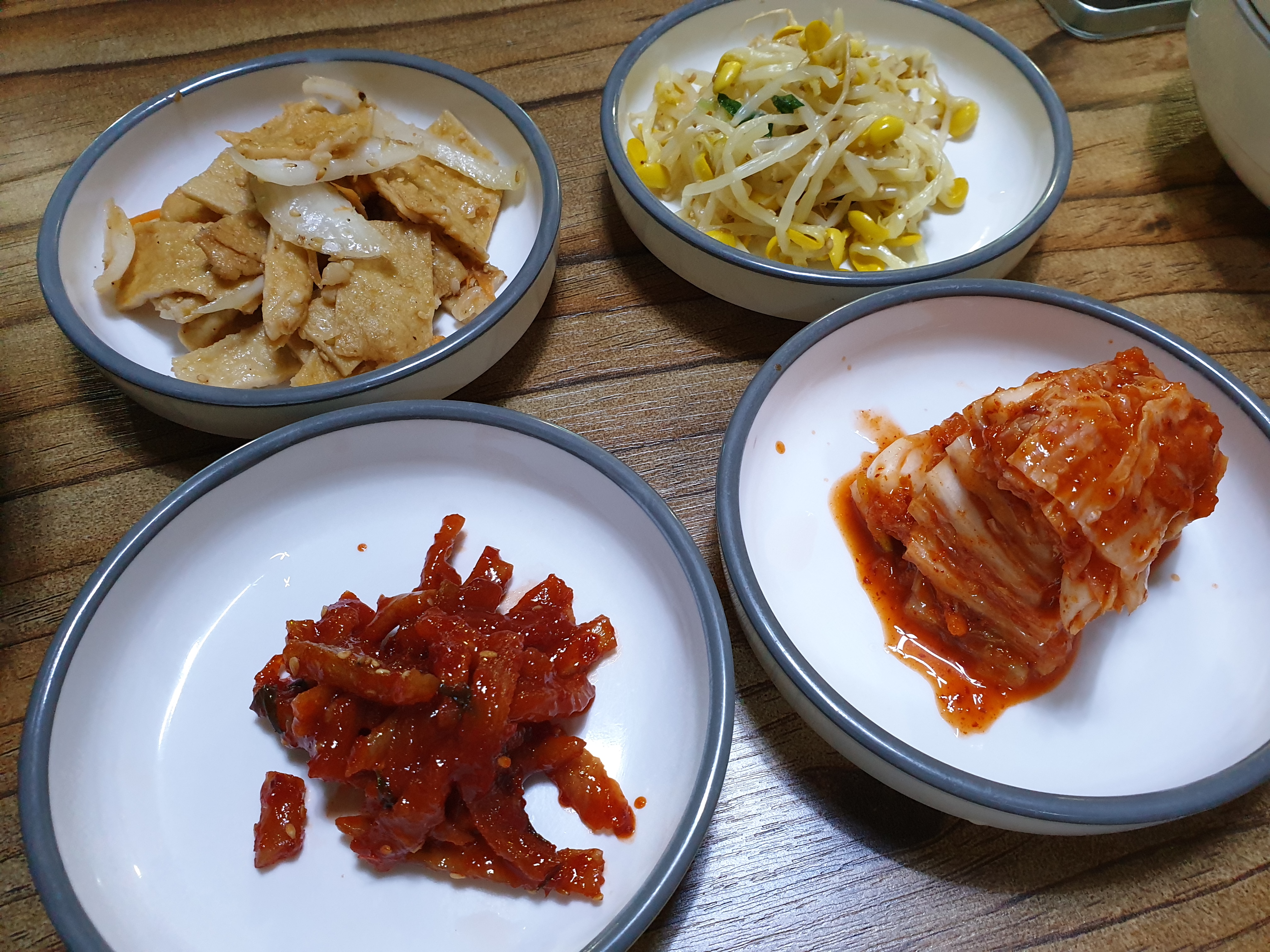 옛뜰 기본 반찬입니다. 아주 기본적인 안주에 무말랭이와 단정하게 썰린 배추김치가 인상적입니다. 어묵볶음과 콩나물도 아주 기본이 되는 밑반찬이죠. 맛은 대체로 다 맛있었습니다. 간도 적당하거나 조금 짭짤합니다.