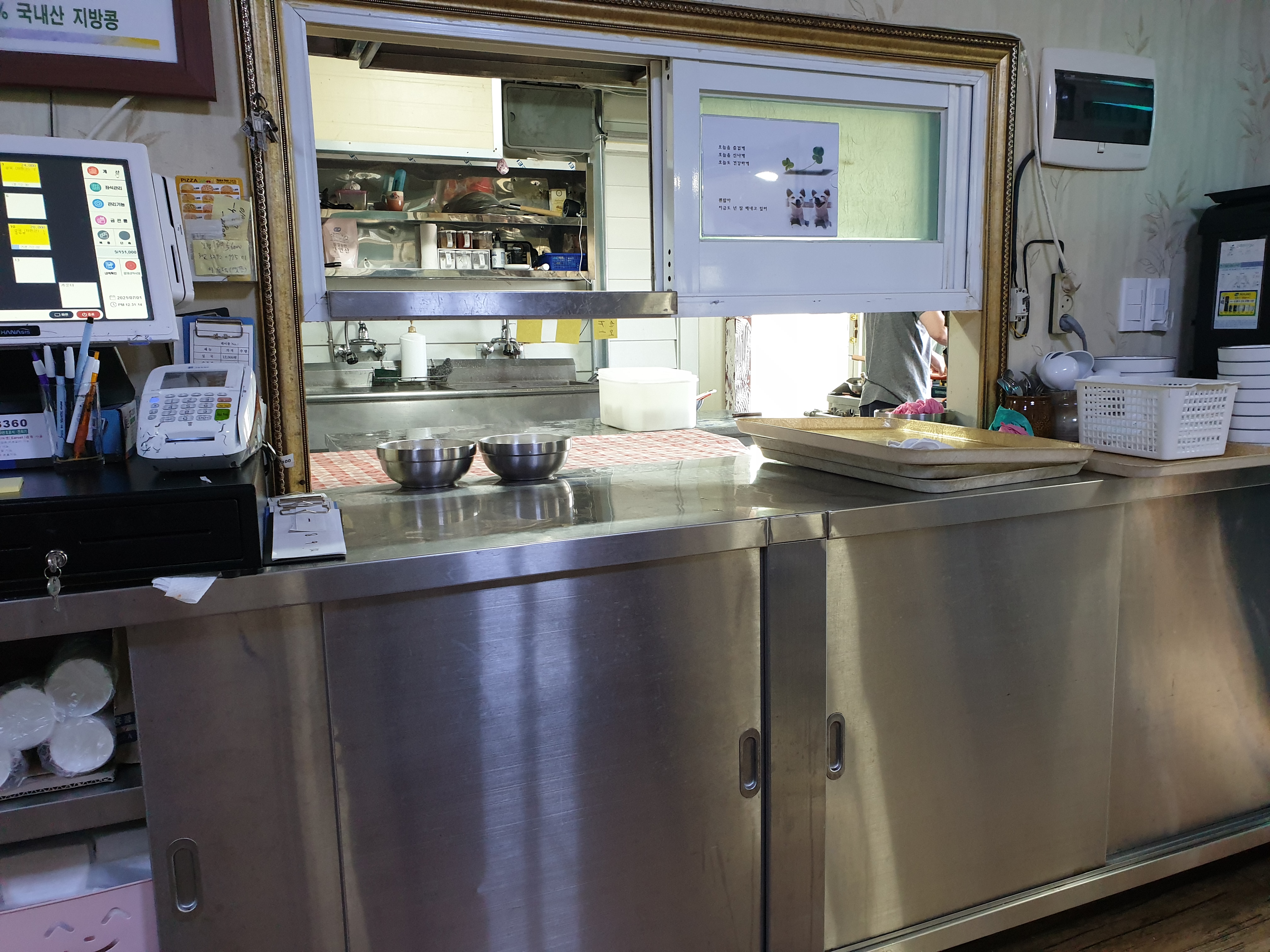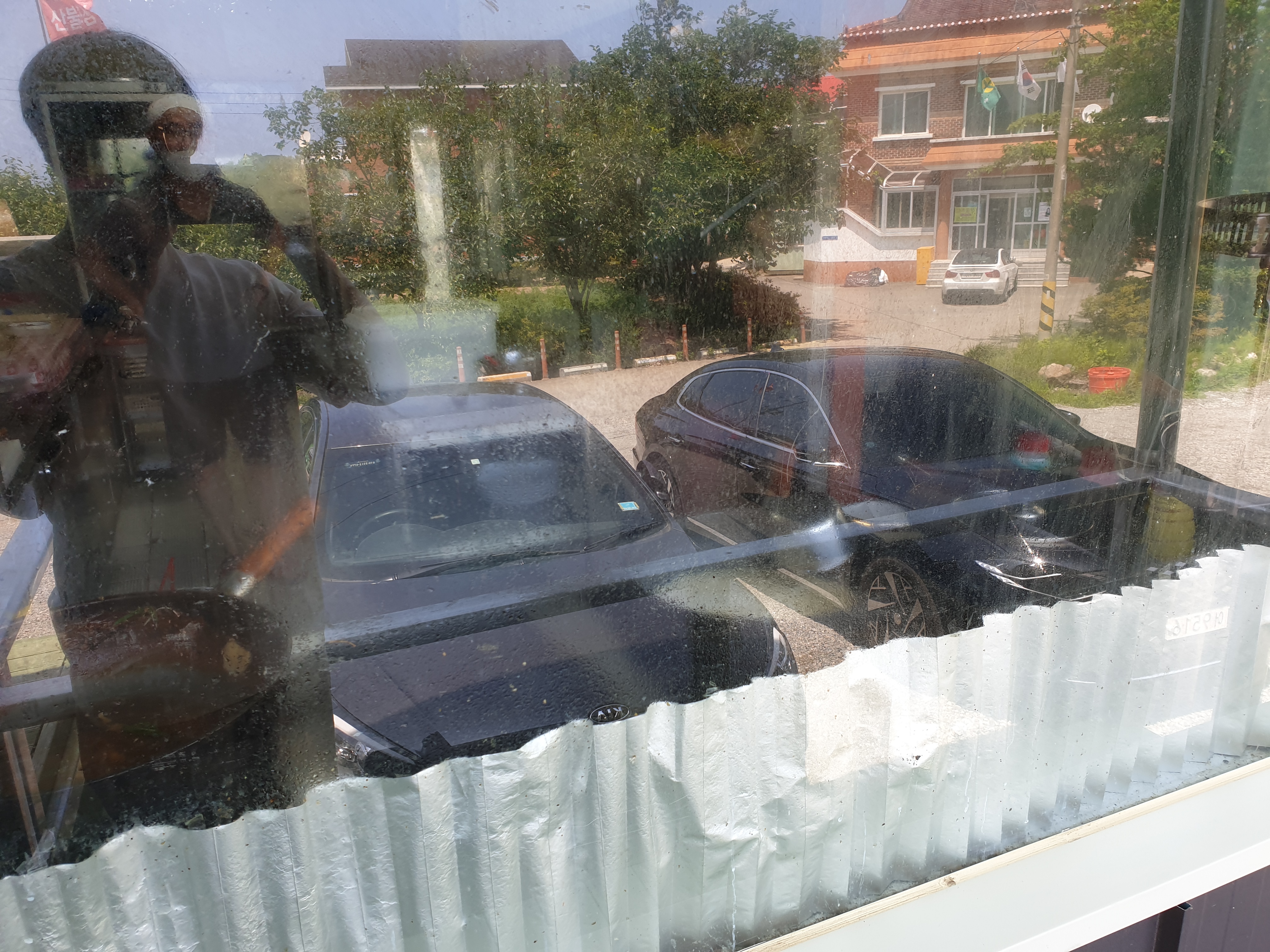 사진으로 찍으니 빛 반사 때문에 내부하 하나도 안보이네요. 이렇게 사장님의 부엌이 바깥창을 통해서 다 보입니다.