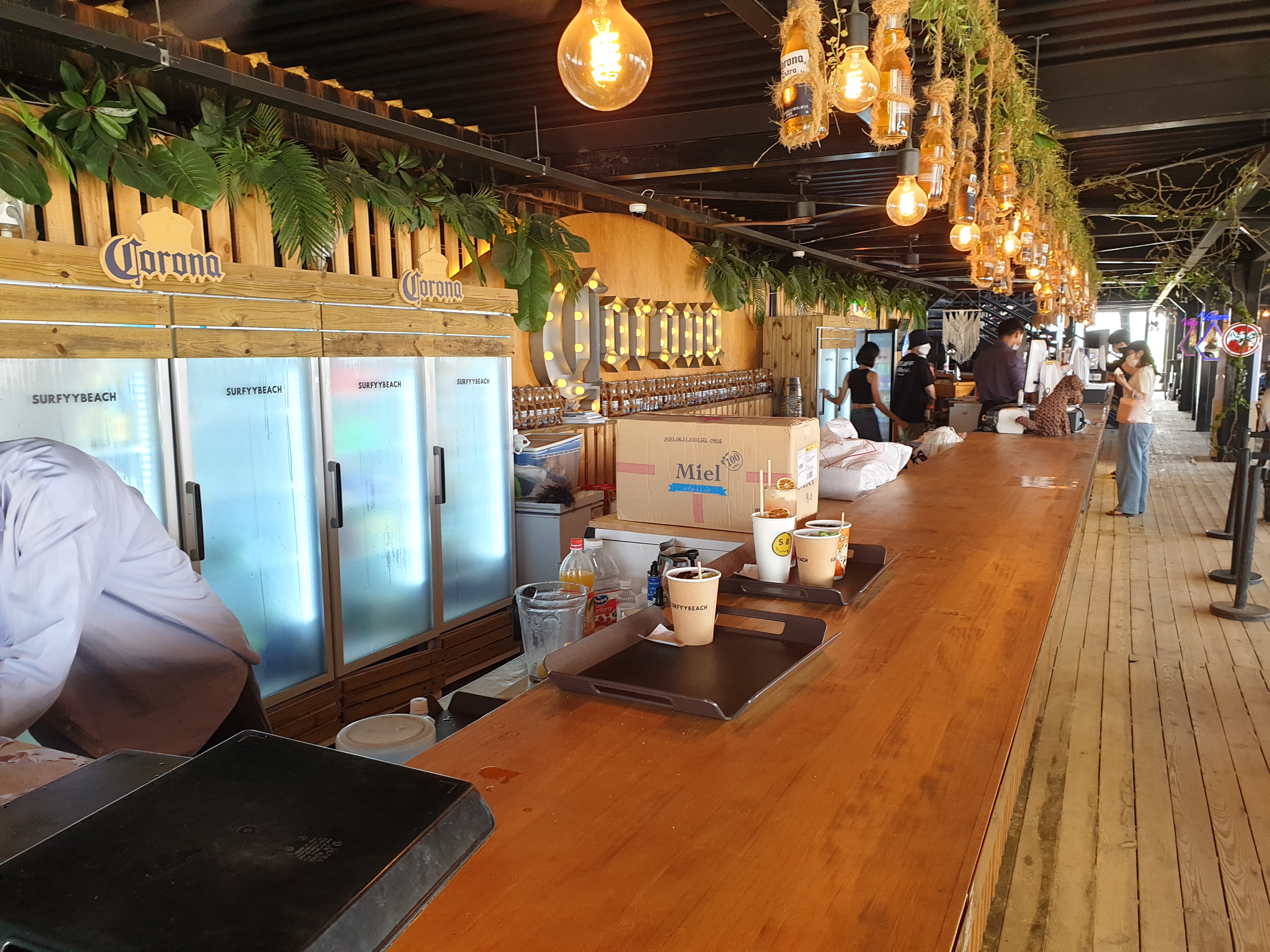서피비치 입구 들어서서 왼편에 있는 서피비치 테라스? 일단 입구만 지나면 분위기가 장난이 아닙니다. 벌써 무슨 동남아에 온 느낌이 들어요. 미국 마이애미는 못가봐서 그 느낌도 있을지는 모르겠네요^^