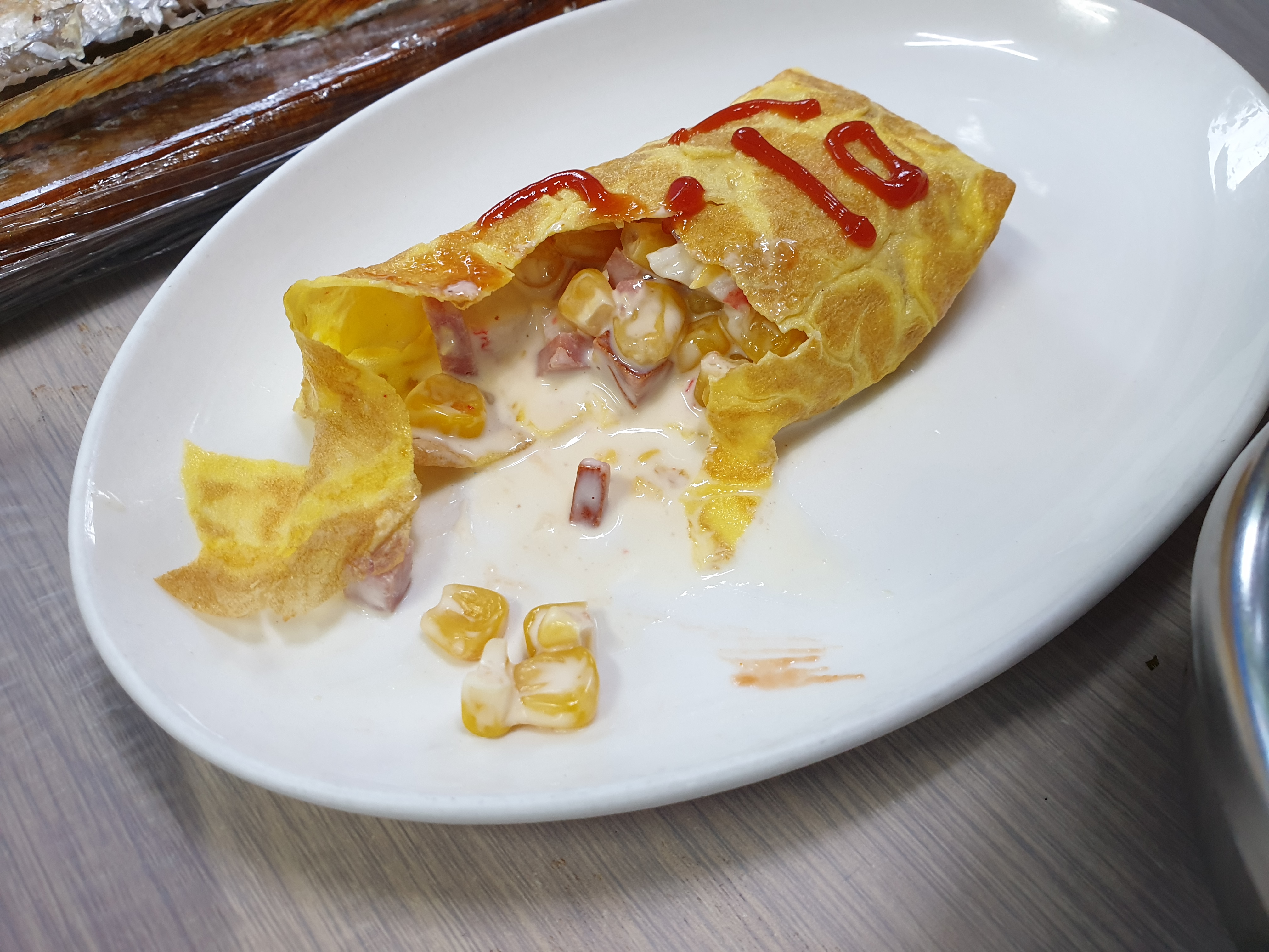 이 계란도 단순 계란말이인줄 알았는데 안에 내용물이 들어있었습니다. 정말 디테일이 장난이 아닌 장방식당입니다. 계란에 햄에 옥수수에 약간 치즈 그리고 마요소스입니다. 치트키 조합으로 맛이 없을 수 가 없는 조합입니다.