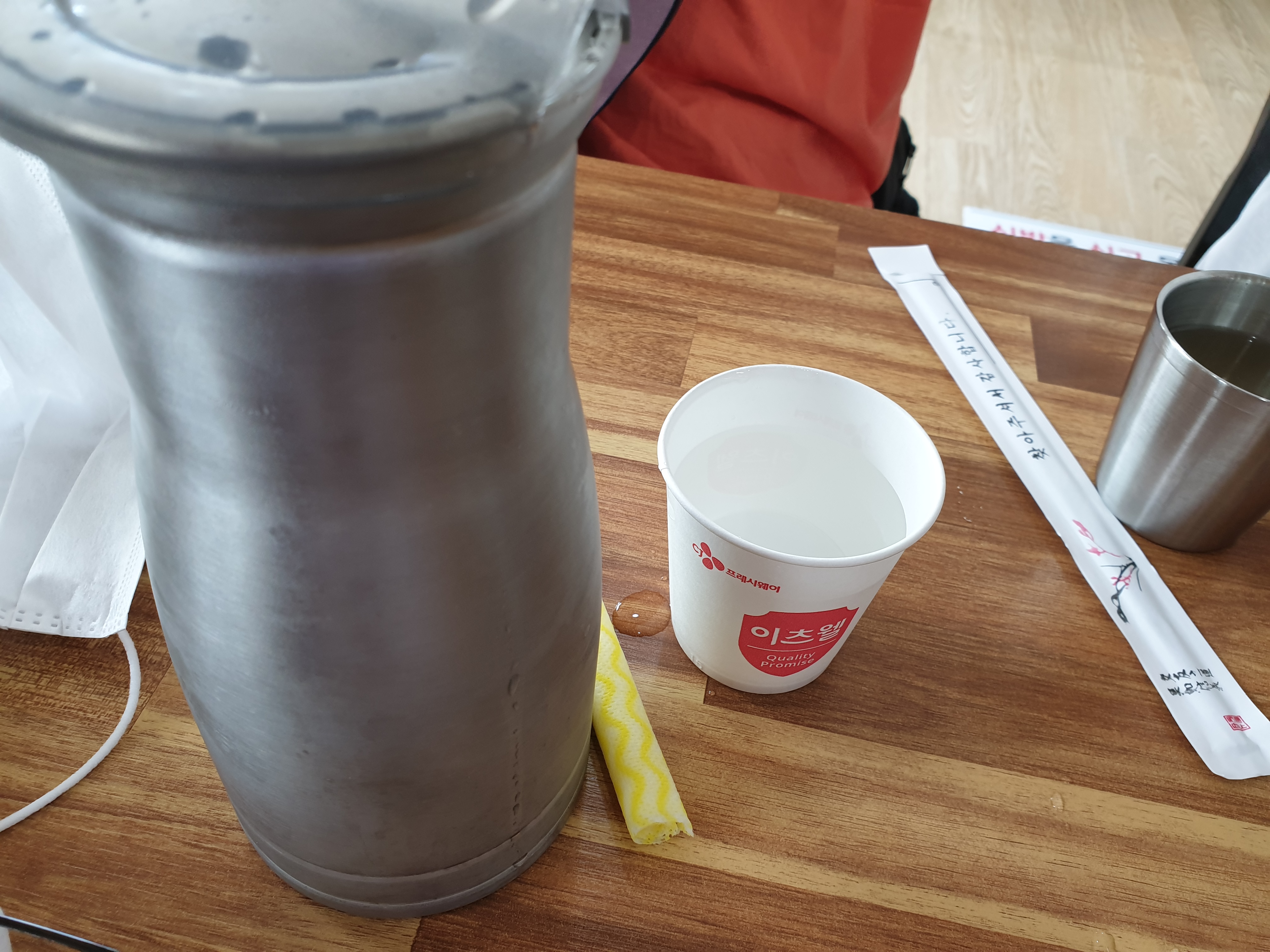 이렇게 물은 일반 생수입니다. 컵은 종이컵이 제공이 됩니다.