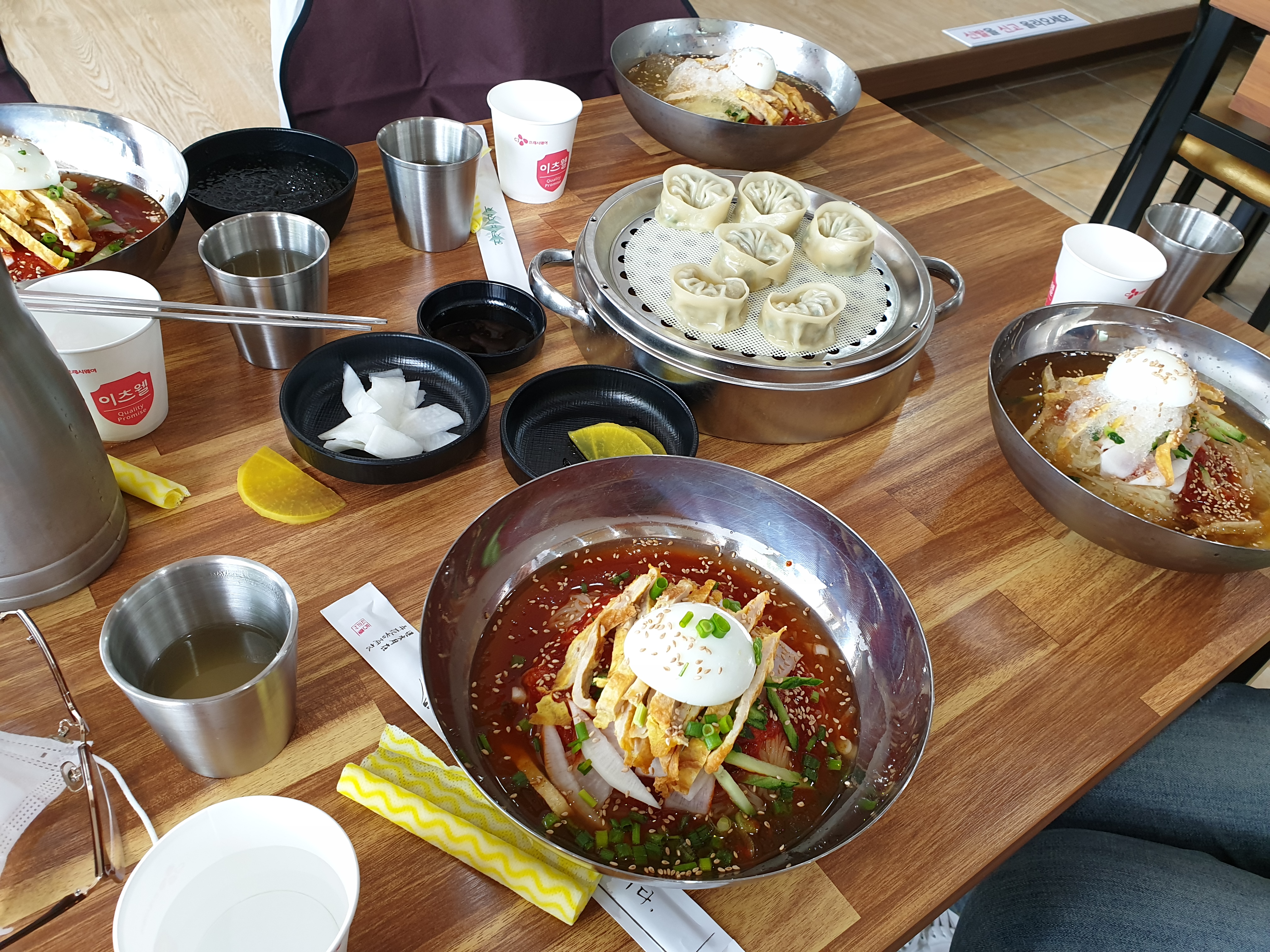 단체샷입니다. 기본 찬은 간소하고 기본적인 대신에 밀면과 만두 등에 집중한 모양입니다. 저렴한 가격에도 불구하고 맛과 퀄리티가 상당합니다. 밀면들도 대체로 맛이 좋고 막 뭐라 할 구석은 없습니다. 만두도 가격에 비해서 양과 맛이 괜찮았습니다.