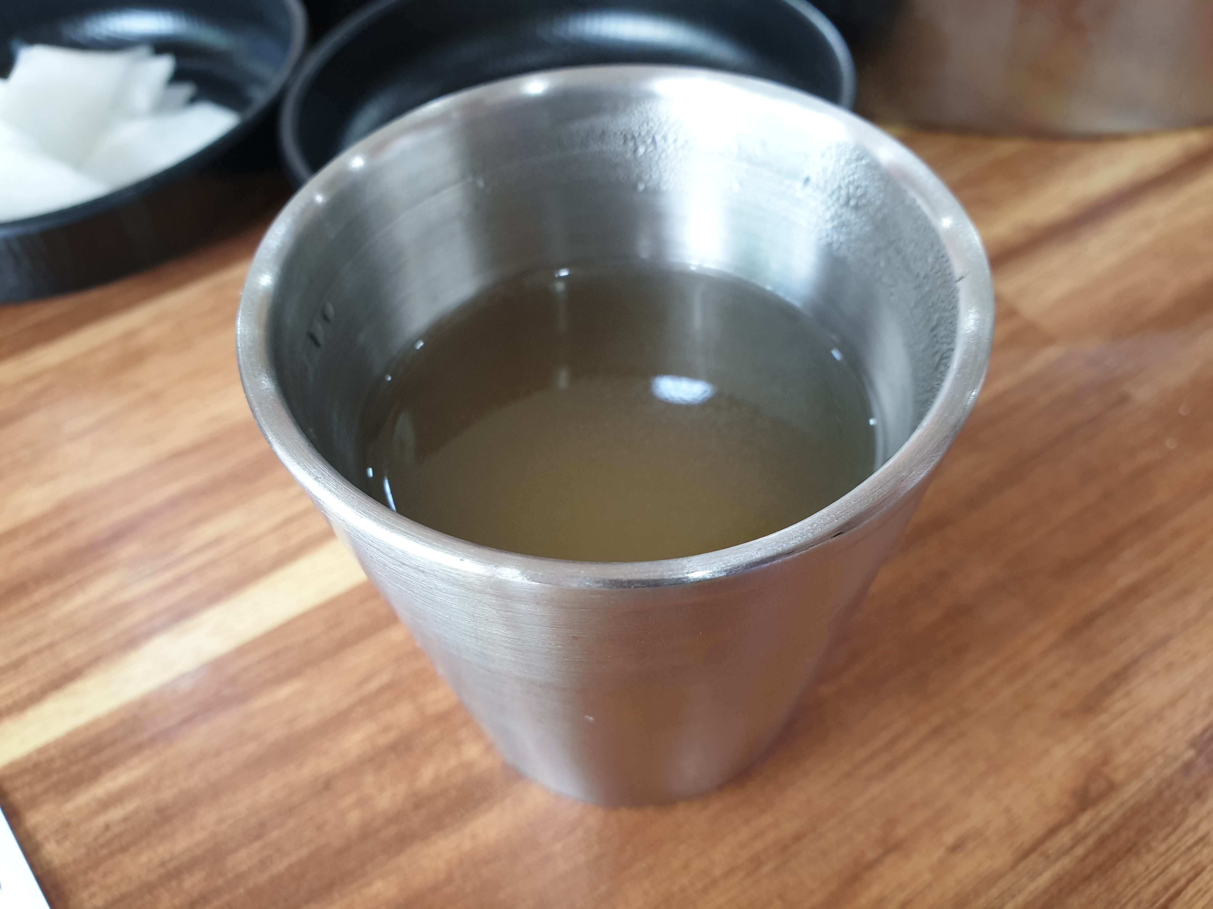 또 이렇게 온 육수도 제공이 됩니다. 식전에 속을 뜨끈히 하는데에 아주 좋습니다. 맛은 일반적인 육수맛입니다. 그렇게 특별한 점은 느끼지 못했습니다. 뜨끈하니 속풀이 용으로 아주 좋았습니다.