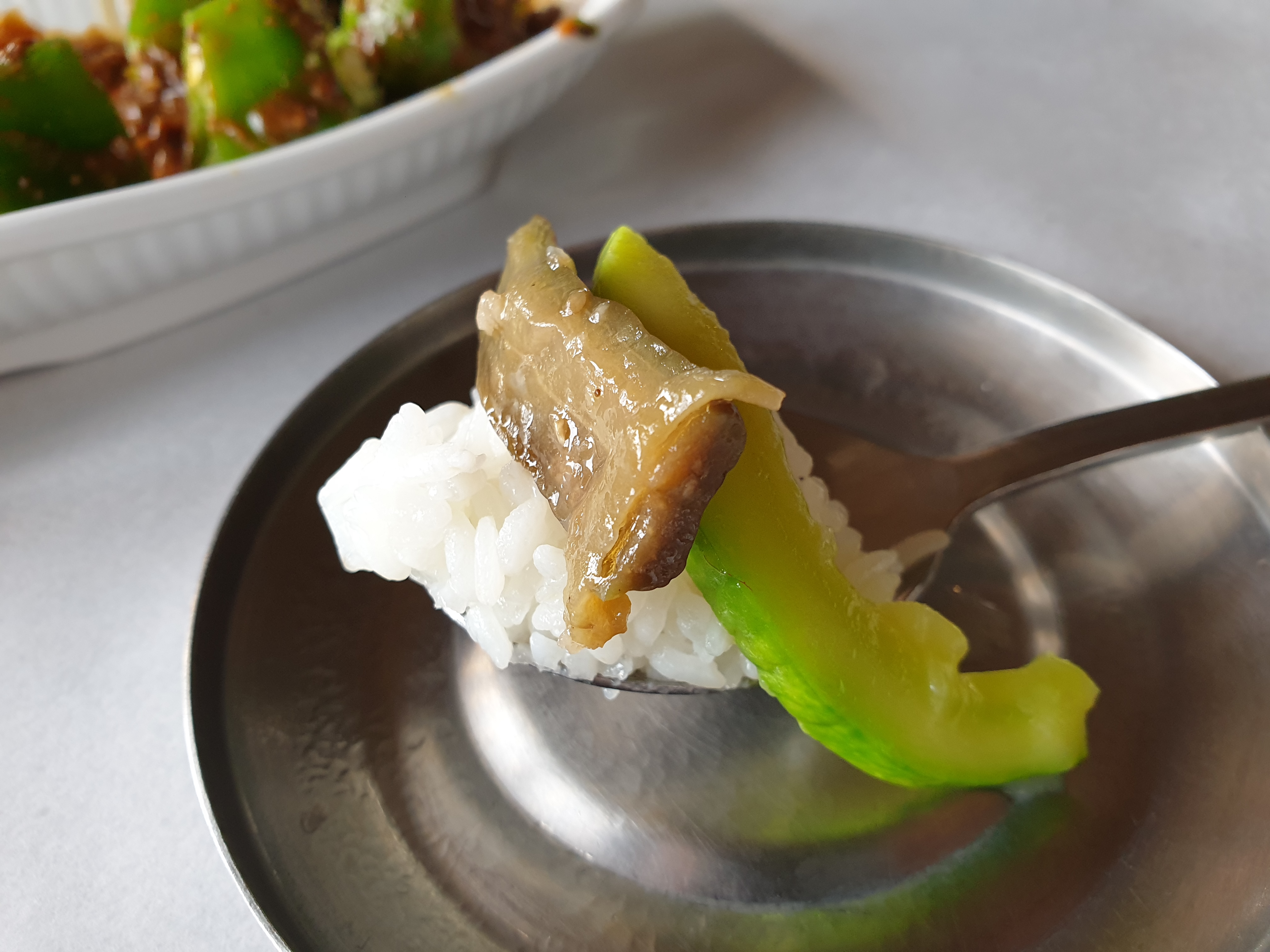 첫 입은 이렇게 볶은것을 모두 한 곳에 올려서 한입에 쓱싹했습니다. 맛이 기가 막힙니다. 자극적인 맛이 아니고 그냥 이 평화로운 제천 경치에 딱 어울리는 맛있는 맛입니다. 슴슴하고 자연스럽고 건강하고 조화롭습니다.