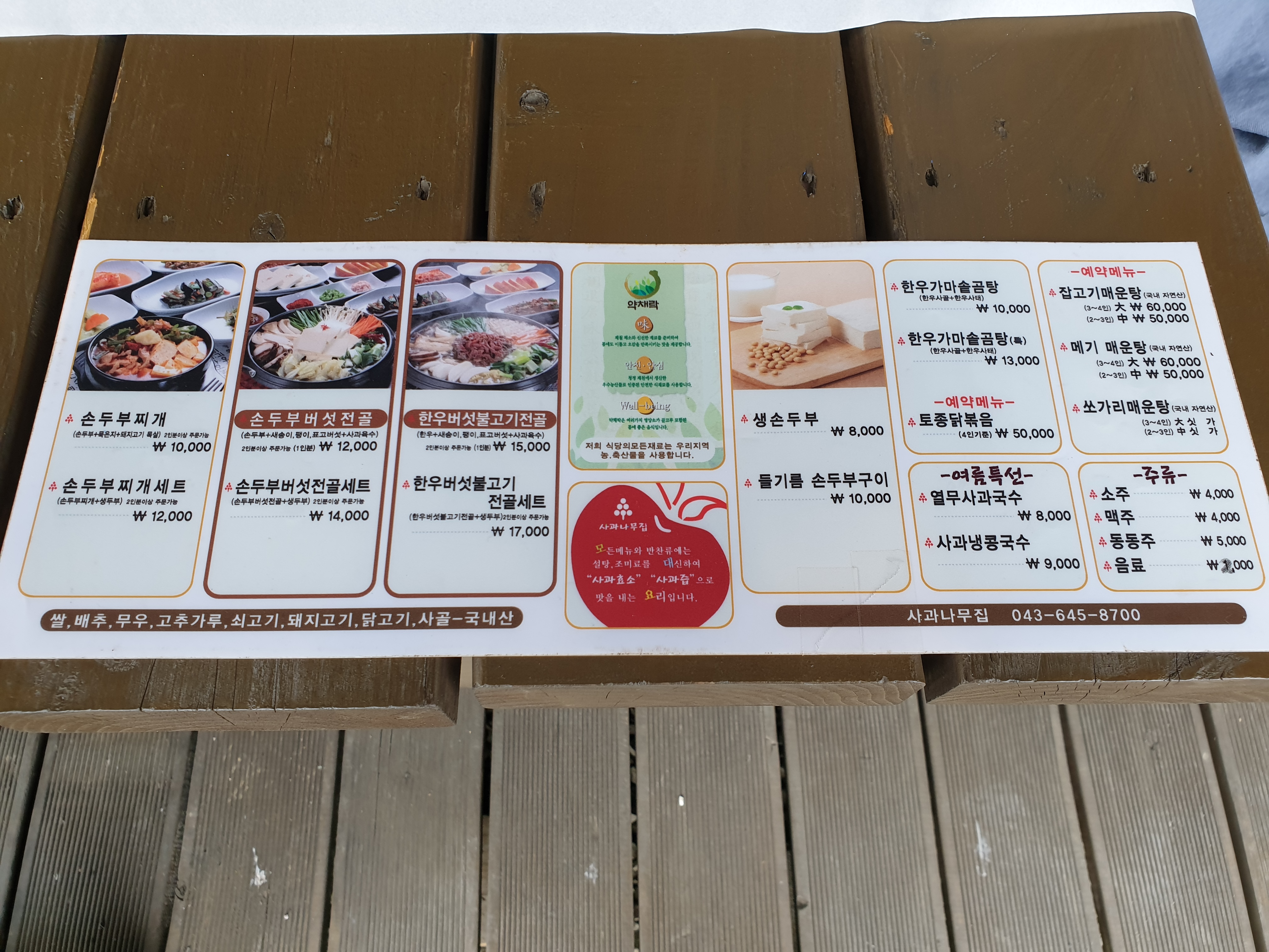 짜자잔 ~ 드디어 메뉴판입니다. 사과나무집은 두부 전문점인듯 ~ 합니다. 저희는 일단 한우버섯불고기전골(15,000원/1인분)과 들기름손두부구이(10,000원), 그리고 열무사과국수(8,000원)를 주문했습니다. 메뉴들을 스윽 보면 사과육수나 사과가 포함된것이 특징입니다. 말만 사과나무집이 아니고 옆에 큰 창고가 있어 사과도 직접 판매를 하십니다...ㅋㅋㅋㅋㅋ