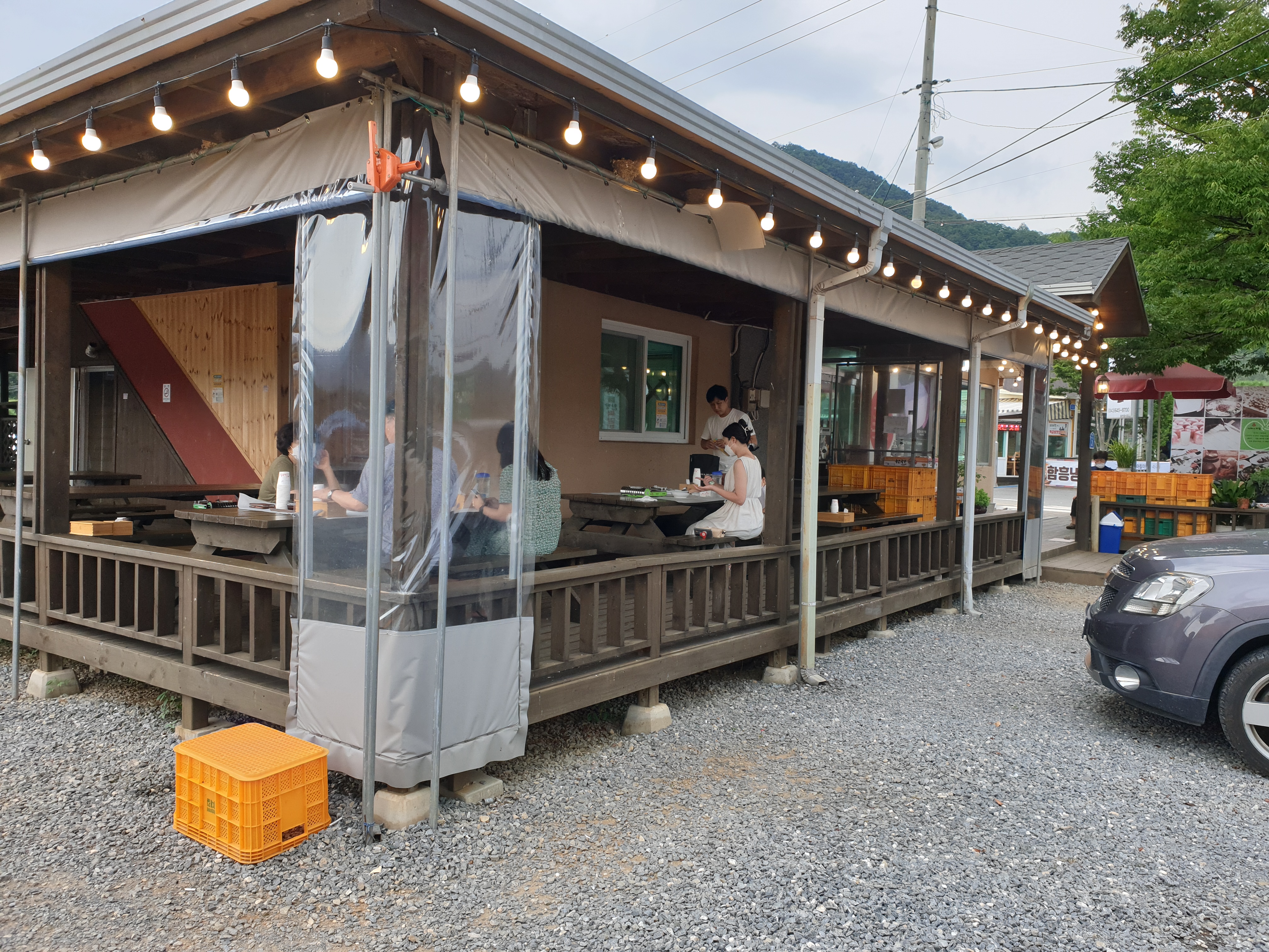 이렇게 옆으로 좀 돌아오면 바깥에서도 먹을 수 있는 자리가 있습니다. 8월임에도 해가 없고 날이 선선하여 우리 일행은 바깥 테이블에서 먹기로 했습니다. 경치랑 바람, 습도가 너무 좋았기 때문입니다.