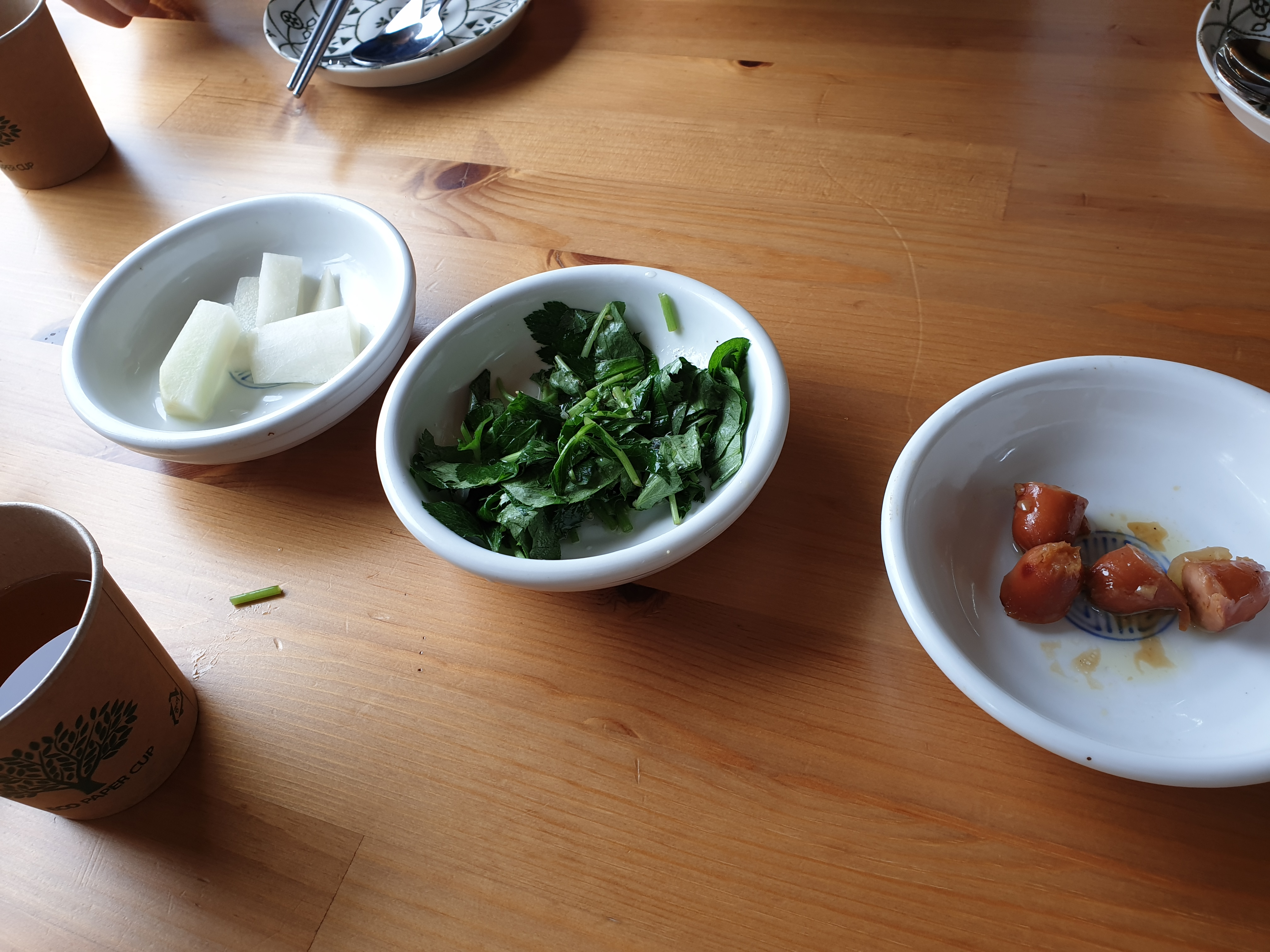 기본 밑반찬입니다. 특별한것 없는 첫인상에 오히려 놀라실 수 있겠습니다. 물은 종이컵에 담겨나오고 이외에 특별한점은 없었습니다. 가게 내부도 상당히 아름다운데 사람도 많고 분주하여 미처 사진을 준비를 못했습니다. 나무와 돌로 된 벽이 인상적이었고 개방형 천장이라 공간이 트여있는 느낌을 받았습니다.