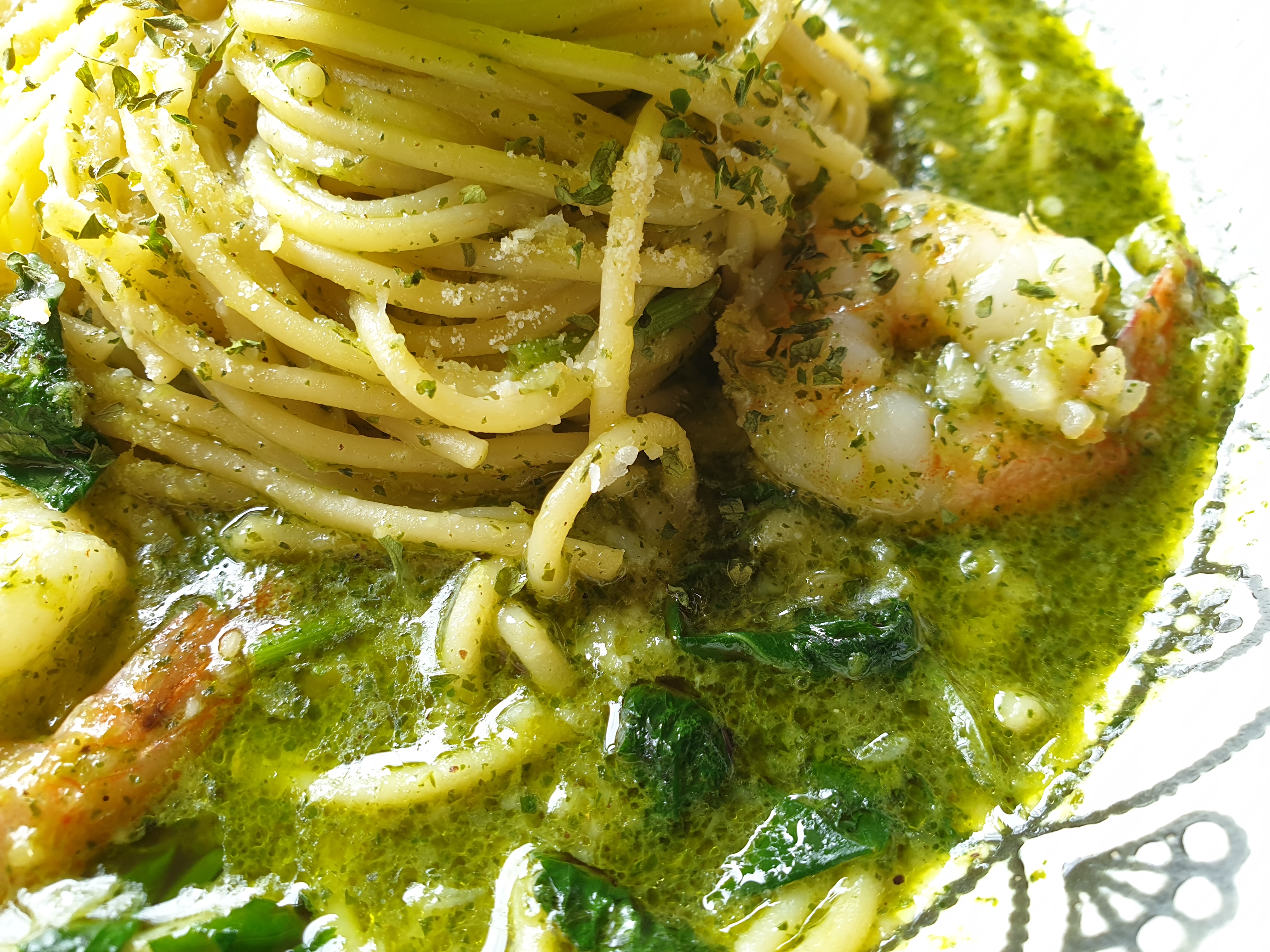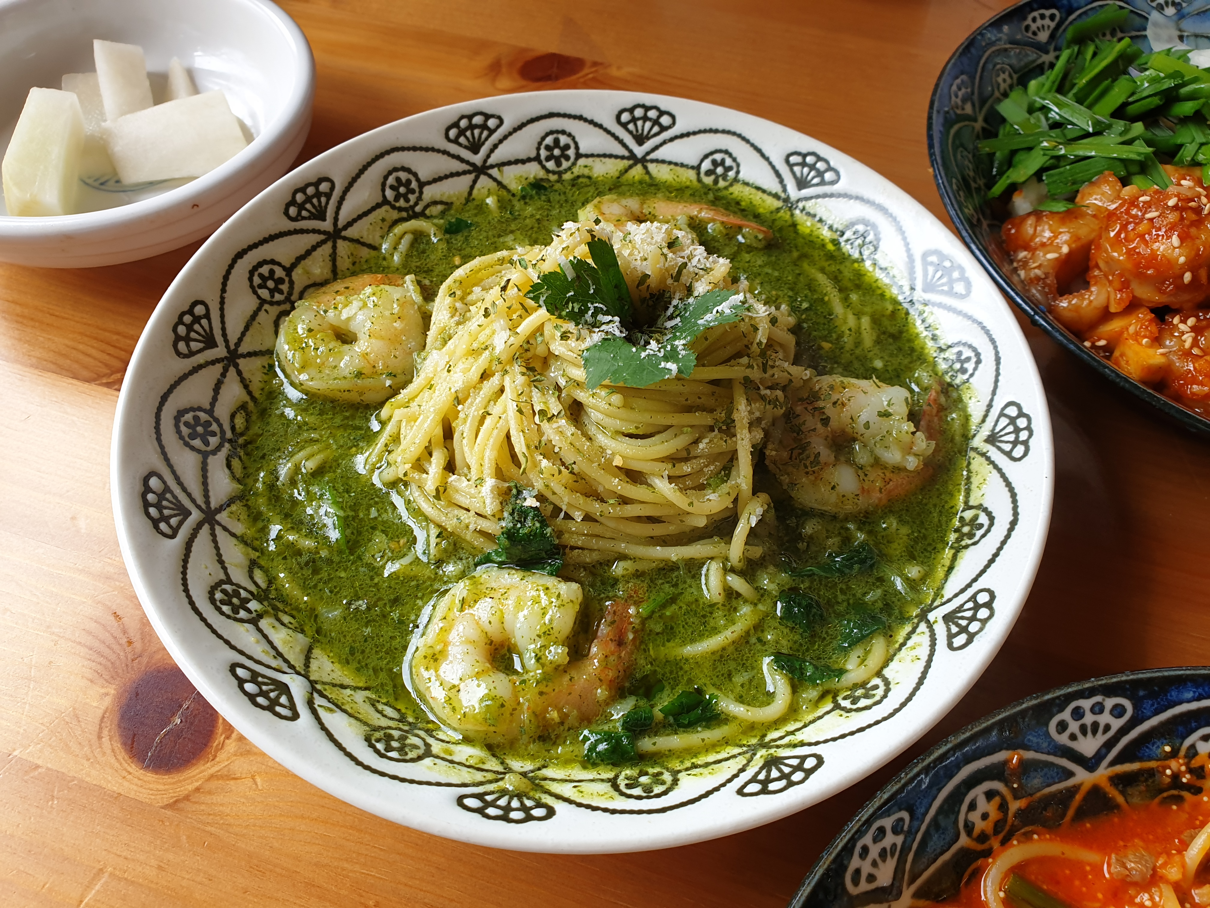 첫번째는 참나물 파스타(15,900원)입니다. 참나물 파스타 이름만 들어도 건강해지는 기분이 듭니다. 비주얼은 처음보는 초록색 파스타입니다. 향은 은은하니 좋습니다. 참나물이 들어갔다고는 하나 나물의 식감을 마구 느끼는 정도로 개입하지는 않고 향과 적당한 식감 맛을 더해주는 느낌입니다. 느끼하지도 않고(들기름 막국수는 마지막엔 질리던데) 담백 고소한게 맛이 아주 좋았습니다.