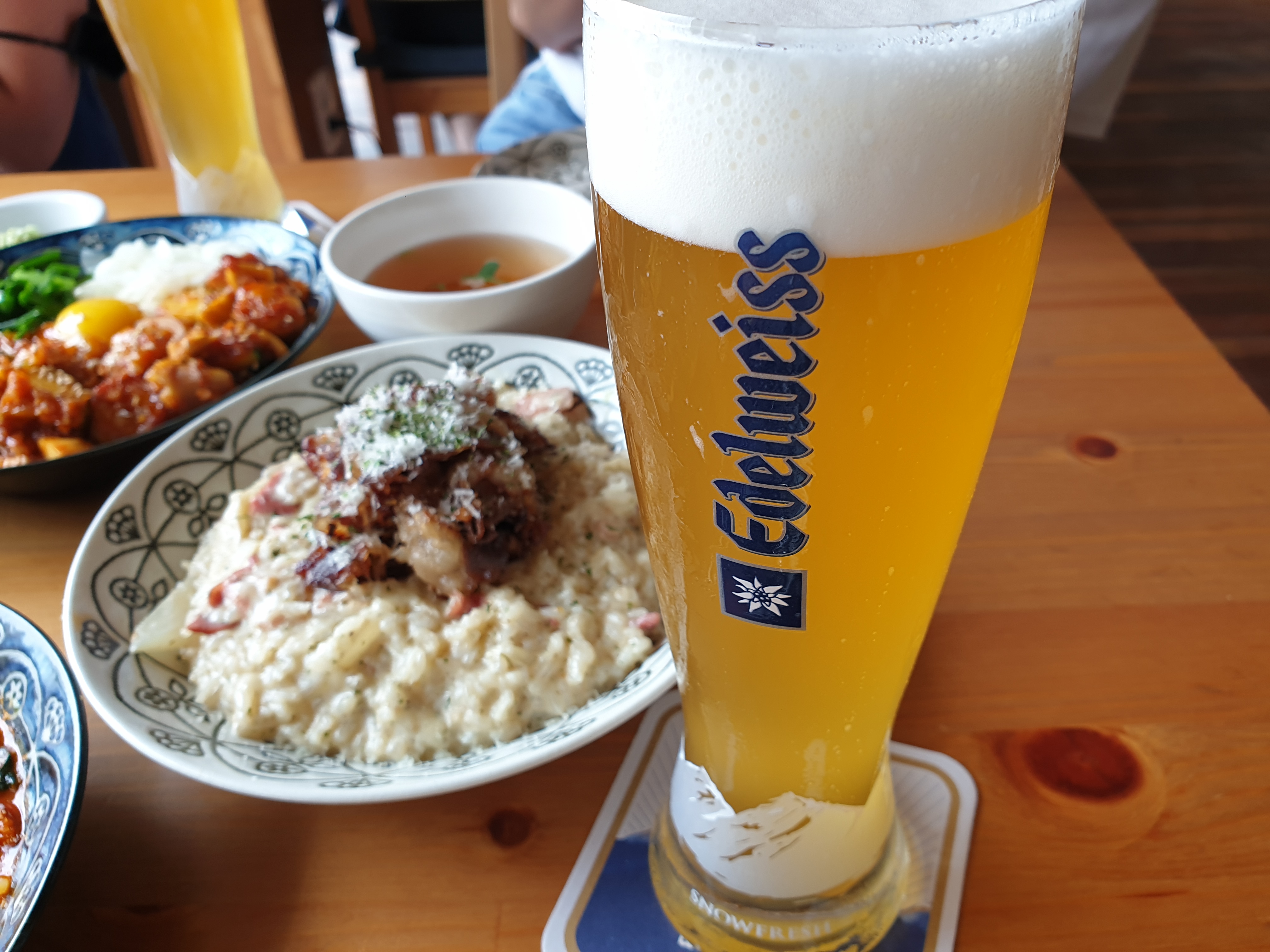 그리고 신기하게도 에델바이스 생맥주를 판매하길래 바로 주문해봤습니다. 과거에 스텔라아르뚜아 생맥주를 보고 바로 먹어봤는데 진짜 크게 감동했던 기억이 있습니다. 마실때마다 잔에 엔젤링 묻어나오고 편의점 맥주랑 그냥 완전히 다른 맛을 내던 그 맥주가 그리웠습니다. 에델바이스 생맥은 감동적이진 않았습니다.