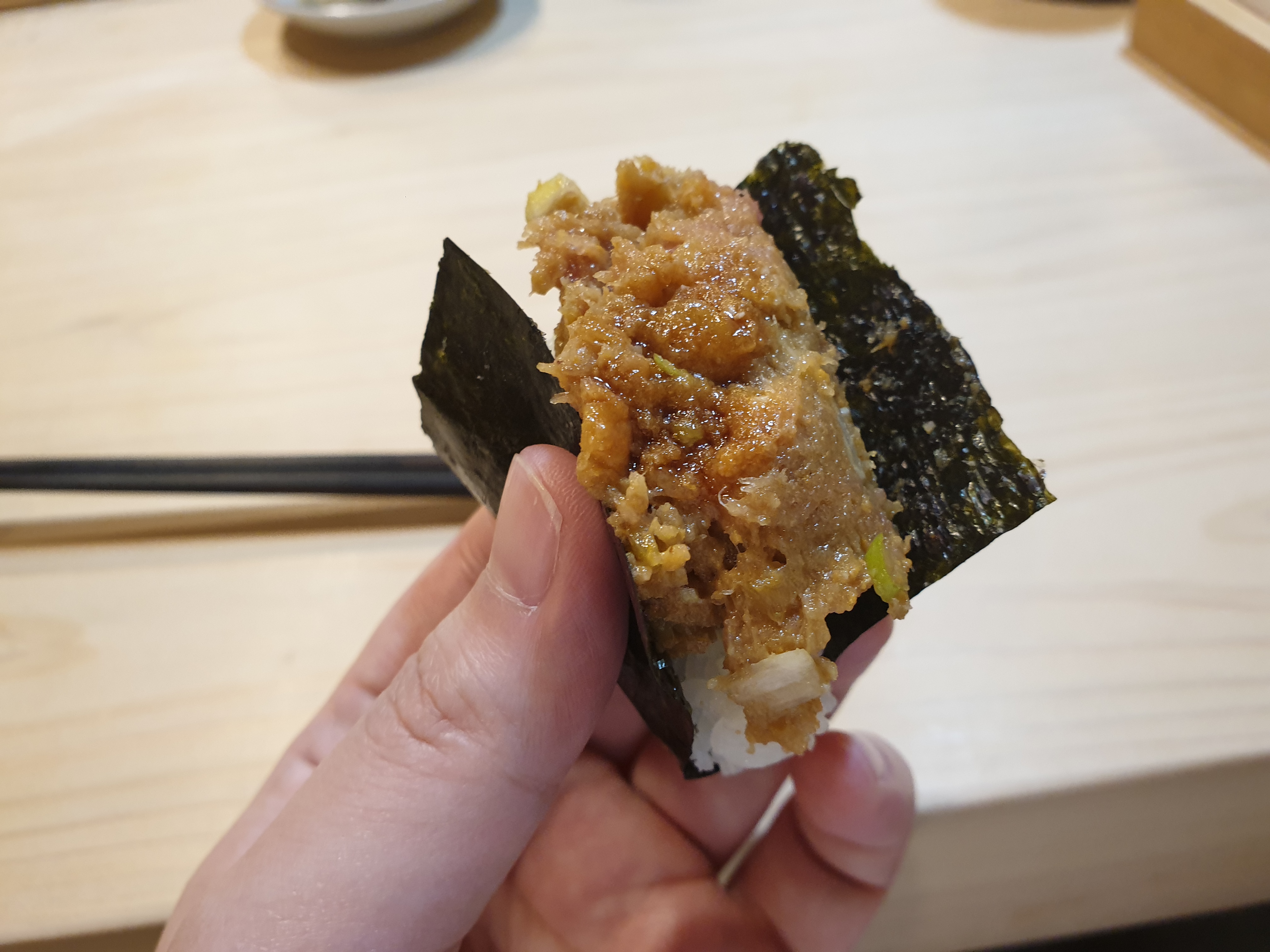 참치 얼굴살을 긁어서 만들어주신거죠. 다른곳에서 먹은거랑은 다른 색깔이 신기했습니다. 그래도 풍미나 맛이나 식감은 엄청 다르지 않고 익숙했어요. 그리고 무엇보다 그냥 아주 맛있습니다. 미쳤음.