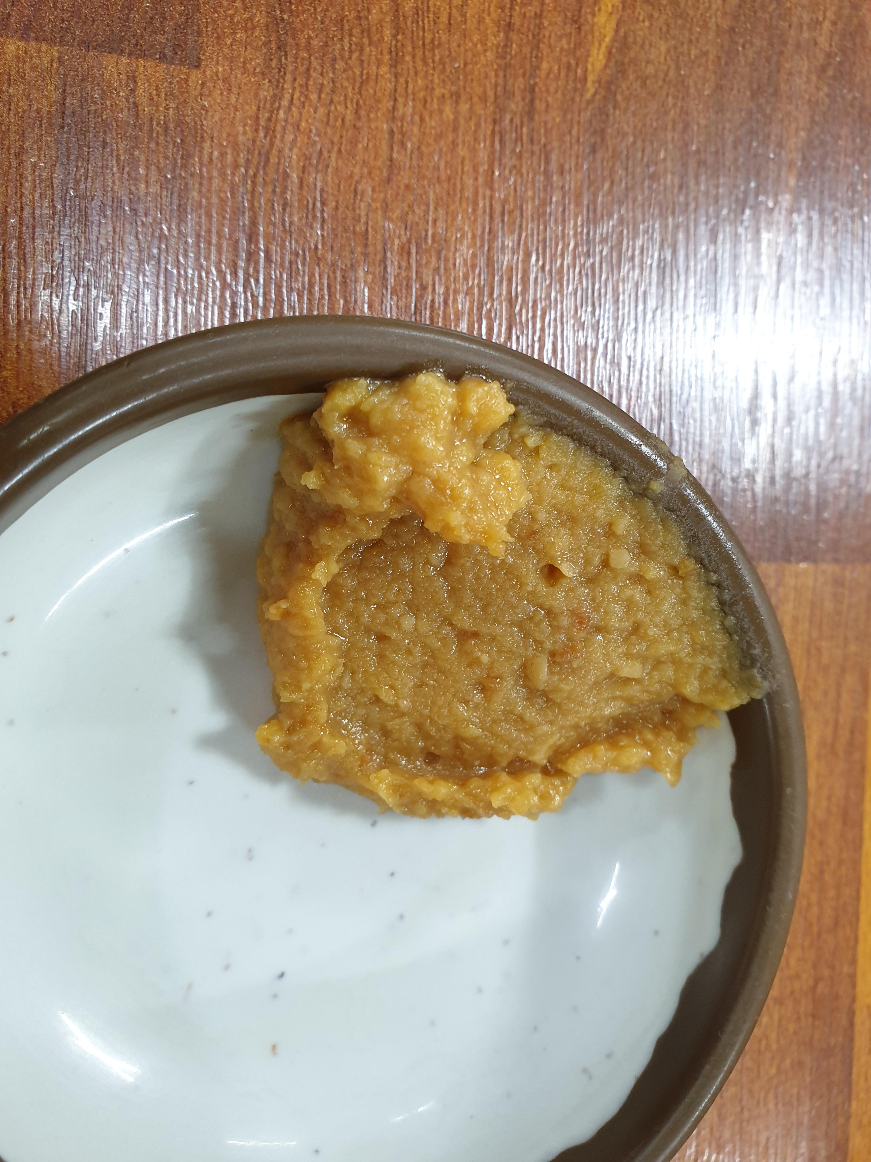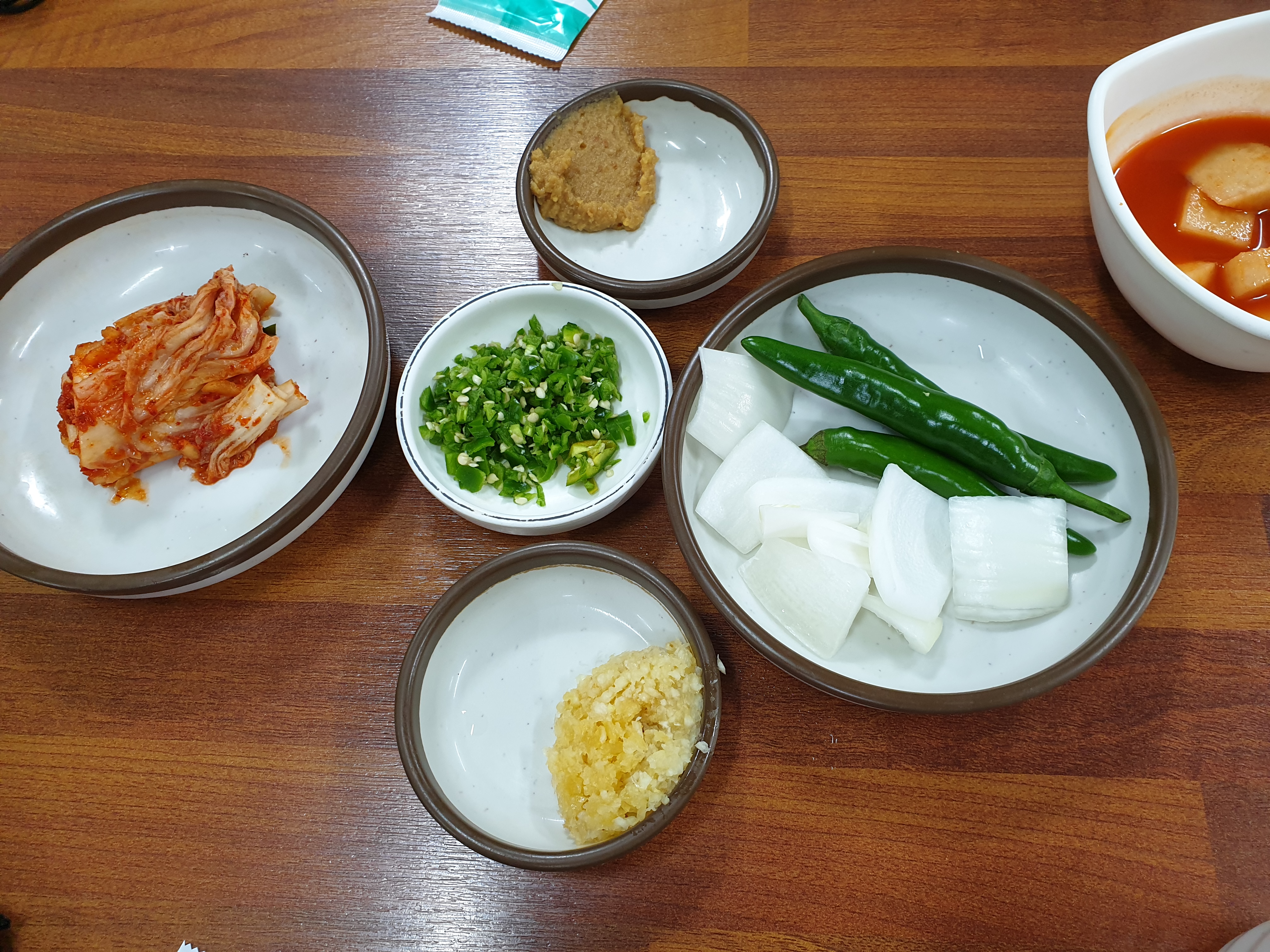 기본 반찬입니다. 배추김치 약간 살아있고 고추 다진거 마늘 다신거 고추 양파 깍두기에 특이한 색깔의 된장까지 제공됩니다.