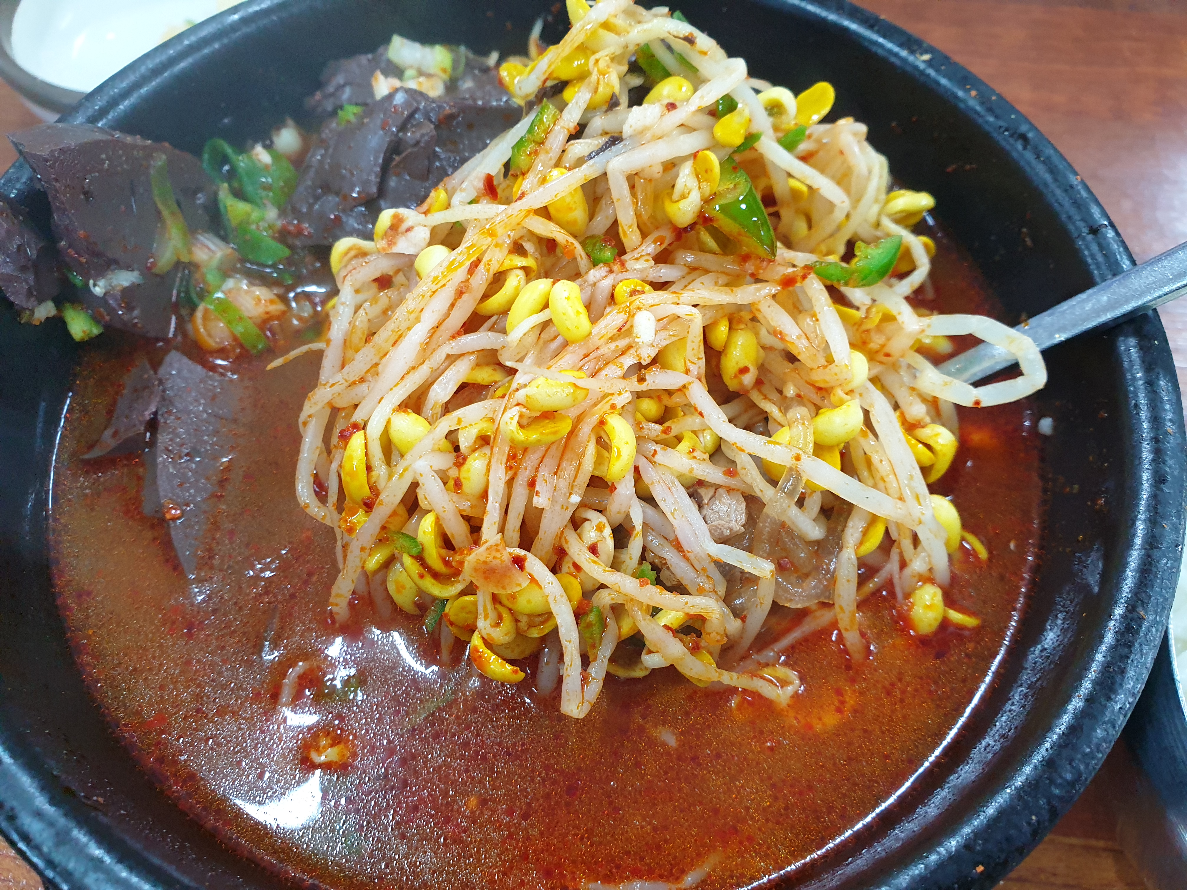 해장국 아래쪽에는 이렇게 콩나물들이 있어서 국물맛을 더해주나? 뒤집어 섞어놓으니 국물이 또 진해 보이는데 입속에 넣으면 괜찮았던 기억입니다.