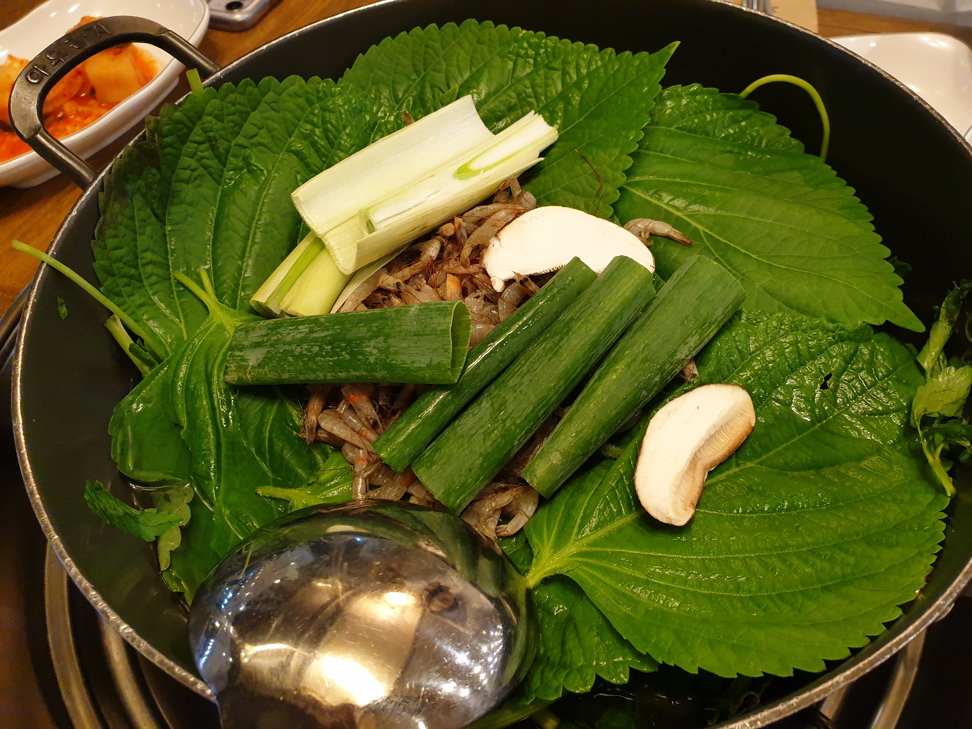 짜잔 ~ 메기매운탕이 나왔습니다. 깻잎들이 올라가있고 대파도 있고 건새우가 많이 올라간것이 국물맛이 시원해질것 같습니다. 적당히 들어가는 건새우 육수 기대가 되는 순간이네용.